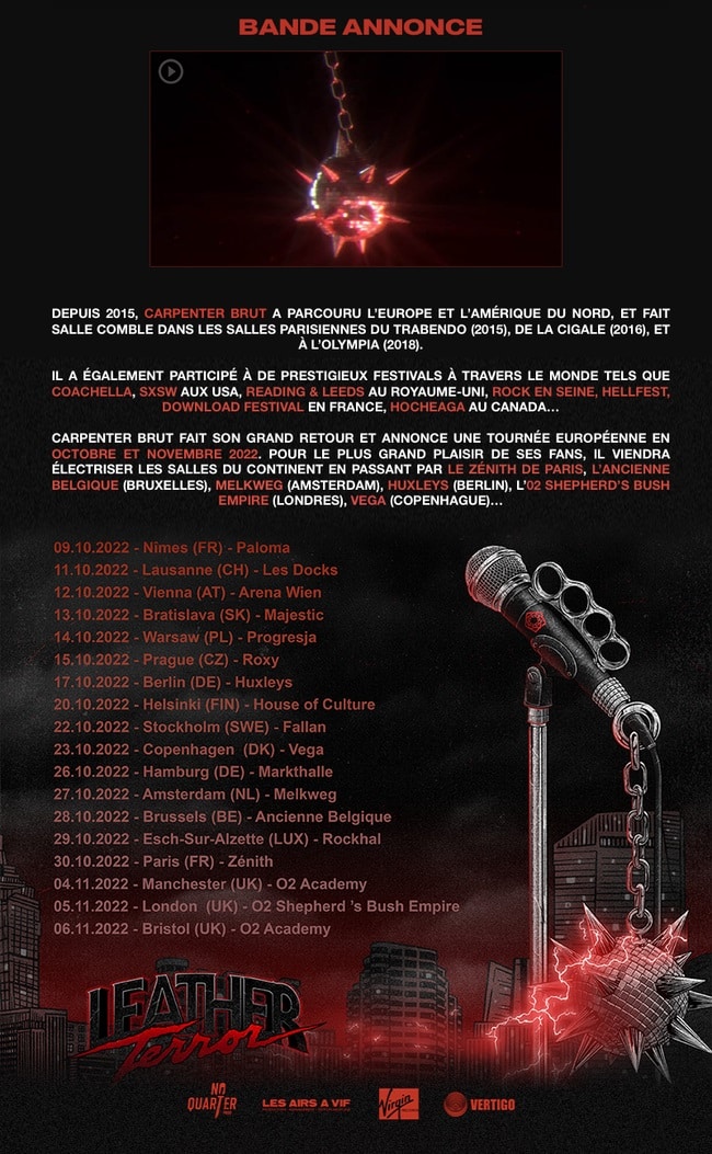 PARIS-MOVE, December 8th 2021 – CARPENTER BRUT sera en concert au Zénith de Paris et en tournée dans toute l’Europe!