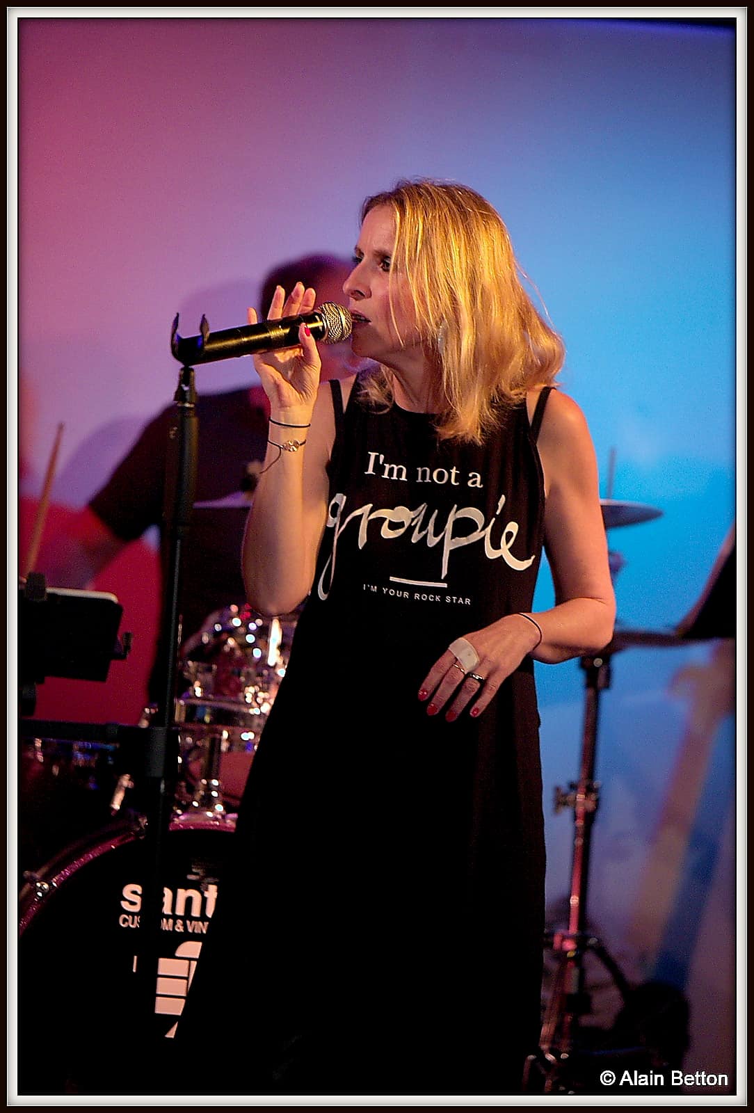 C’est au tour des musiciens de Blues Unlimited, Paul Massiani à la guitare électrique, Denis Salvani à la basse, Christian Watterinckx au chant et guitares de prendre possession de la scène, et pour Sandra Célisse au chant et Dominique ‘Dom’ Lambert à la batterie de la retrouver et ainsi poursuivre ce premier set explosif. Très vite, au fil des premiers titres, ‘Lay Down Sally’ de Clapton, ‘What’s Up’ de Four None Blondes, ‘City of New Orleans’ de Steve Goodman, la température ambiante va monter en flèche, accélérant la fonte des glaçons dans les verres.