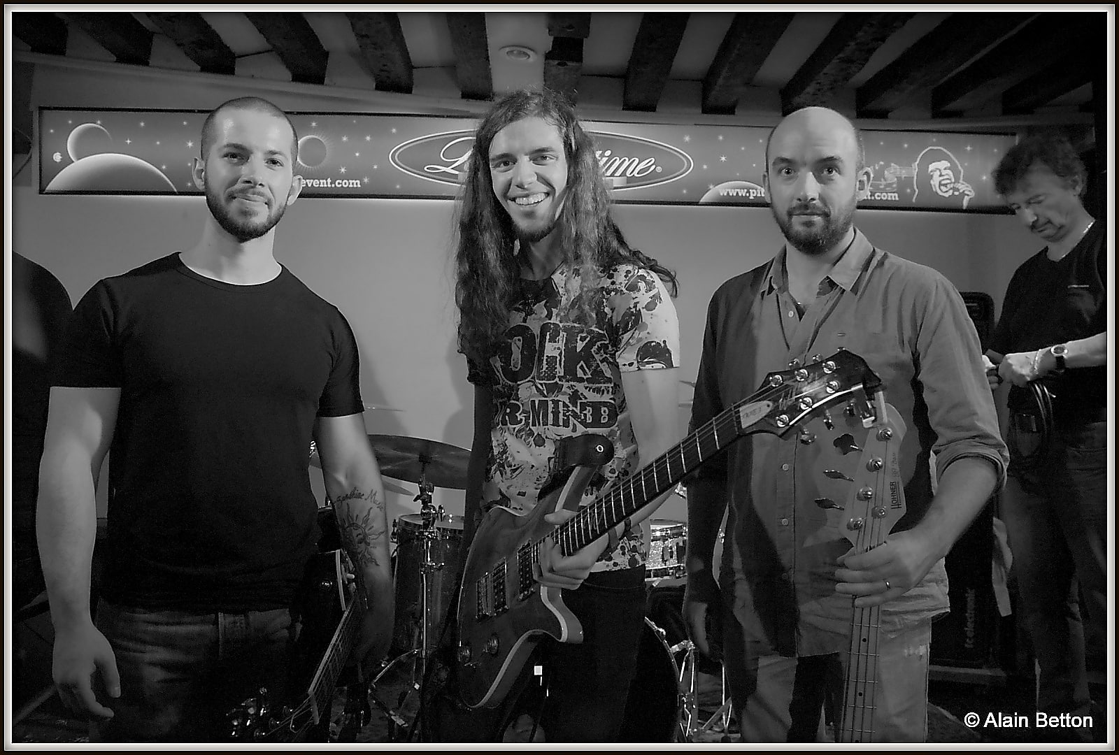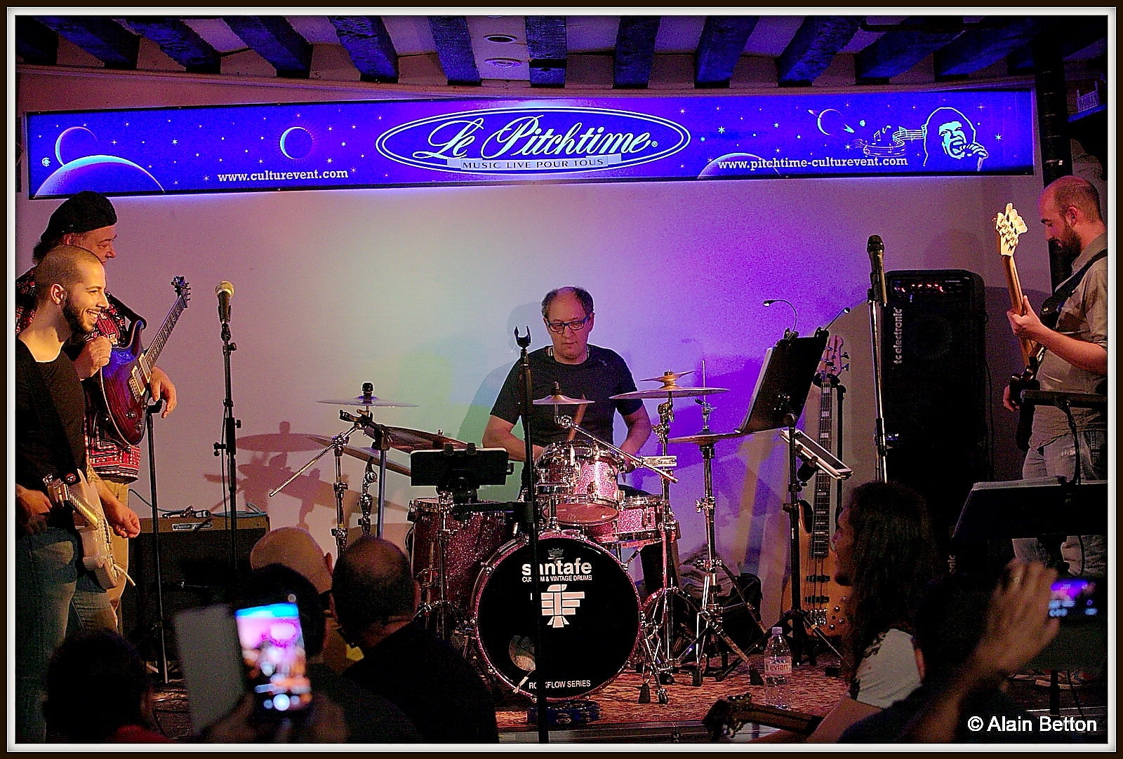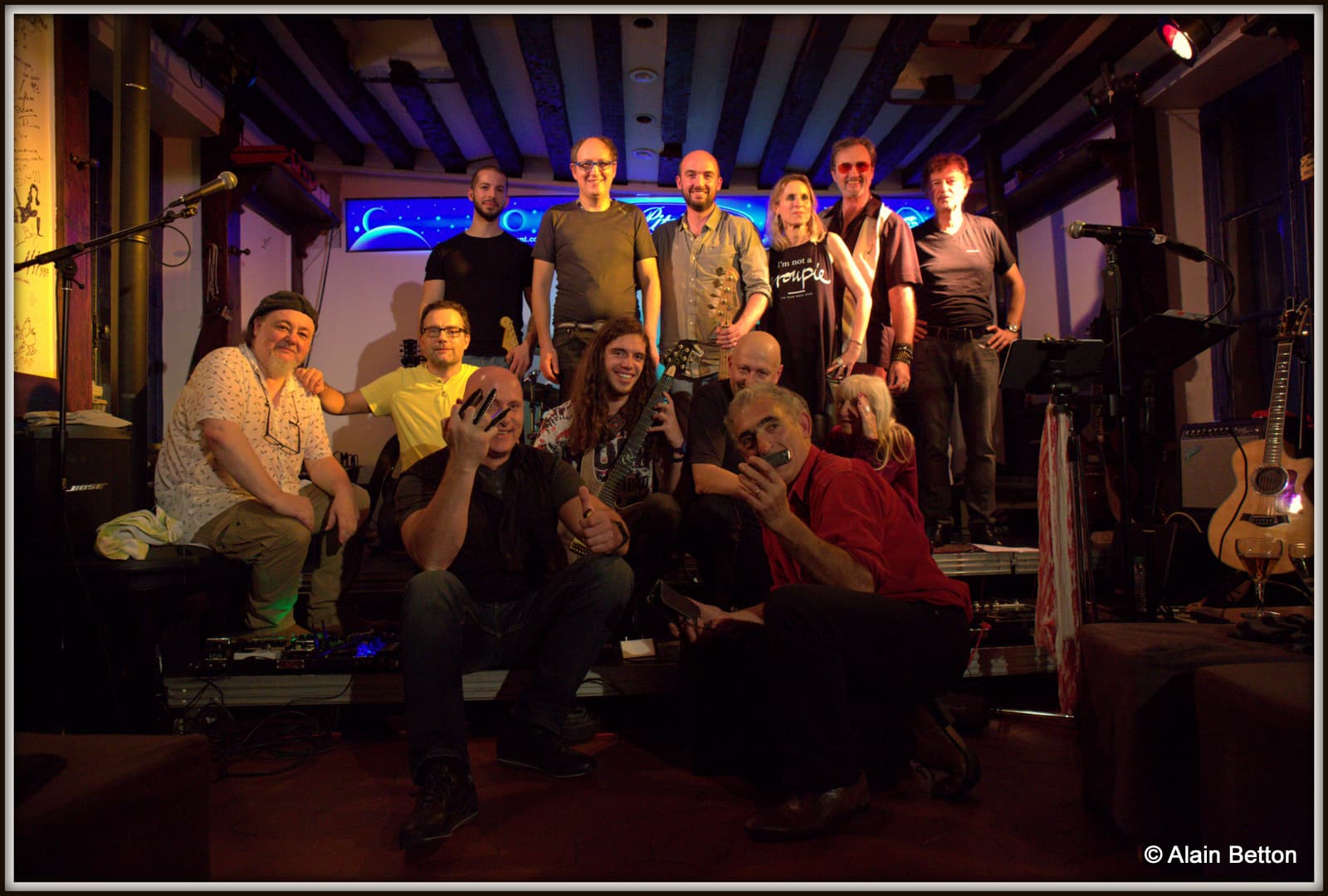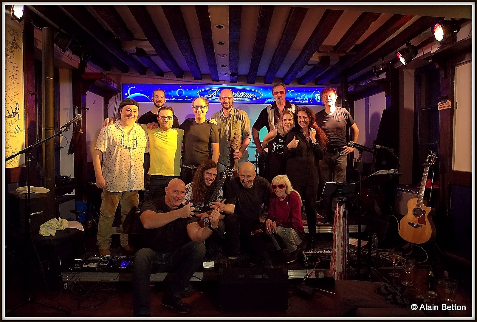 Le concert a débuté à 22 heures et les aiguilles de l’horloge flirtent quasiment avec le 2, car il est presque 2 heures du matin… Fin du concert. Mais il est aussi l’heure d’une petite séance photo avec tout ce beau monde, tous réunis en soutient autour d’Alain Sabbatier, pour que continue à vivre le Pitchtime. Car des soirées comme celle que nous venons de vivre, insatiables de live, impatients de faire de belles découvertes et de nouvelles rencontres, de retrouver des amis, nous en voulons encore, encore et encore. Alors, pour que le Pitchtime puisse encore vous proposer de beaux et bons concerts, faites un geste, petit ou grand, mais faites le geste de donner pour que le Pitchtime ne ferme pas et puisse continuer à faire jouer groupes, chanteuses et chanteurs!