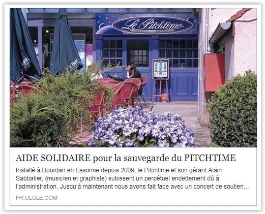 Artistes qui avez joué au Pitchtime, artistes qui souhaitez un jour venir jouer ici, à Dourdan, n’oubliez pas que des personnes comme Alain Sabbatier se donnent corps et âme pour que vive la musique live, et pas que dans de grandes salles. Vous aussi, faites le geste qu’il faut et cliquez ICI pour sauver le Pitchtime!