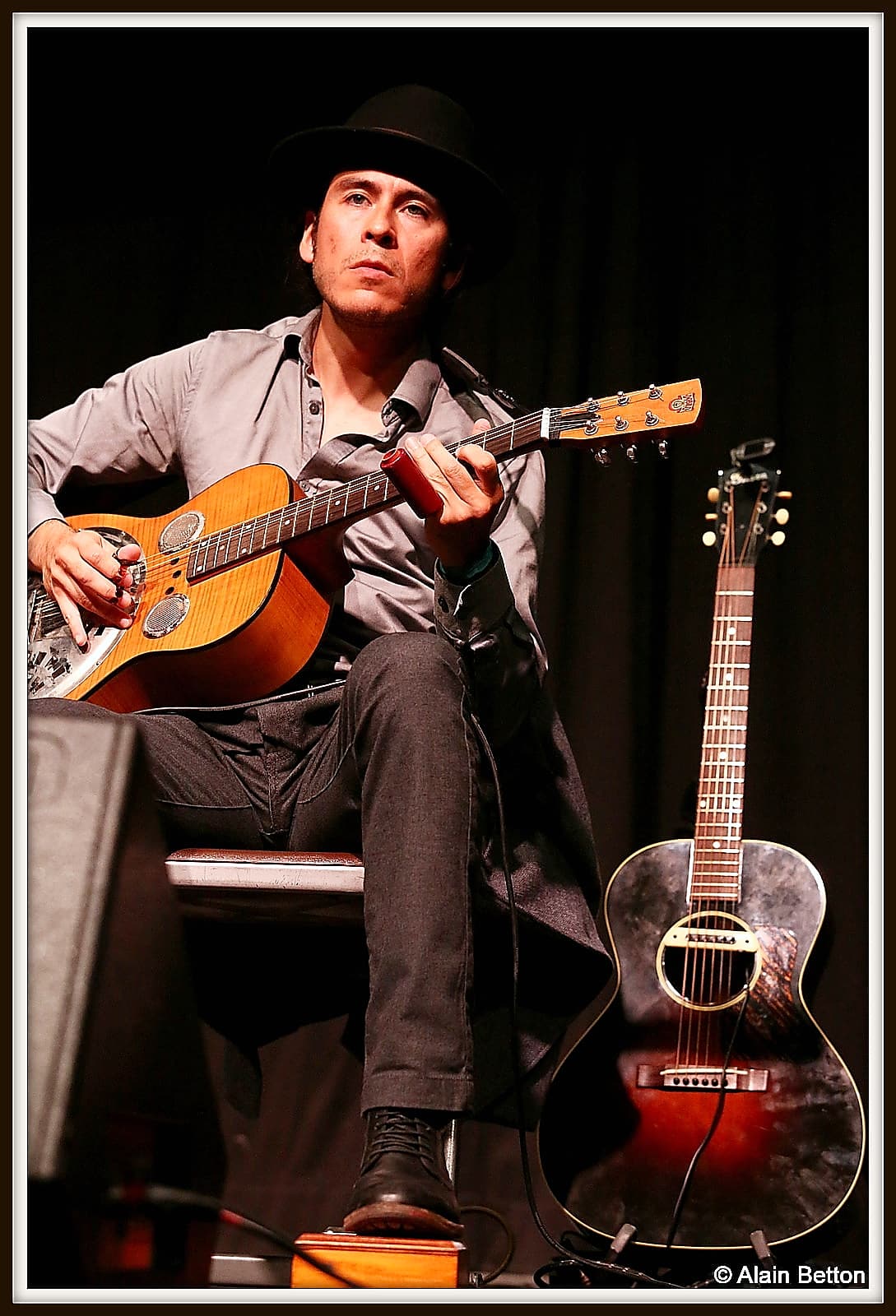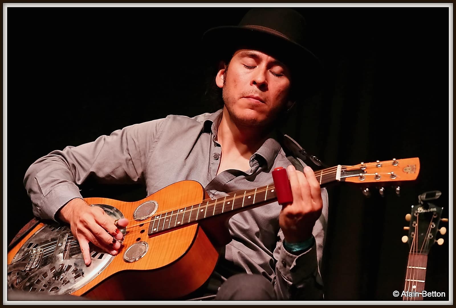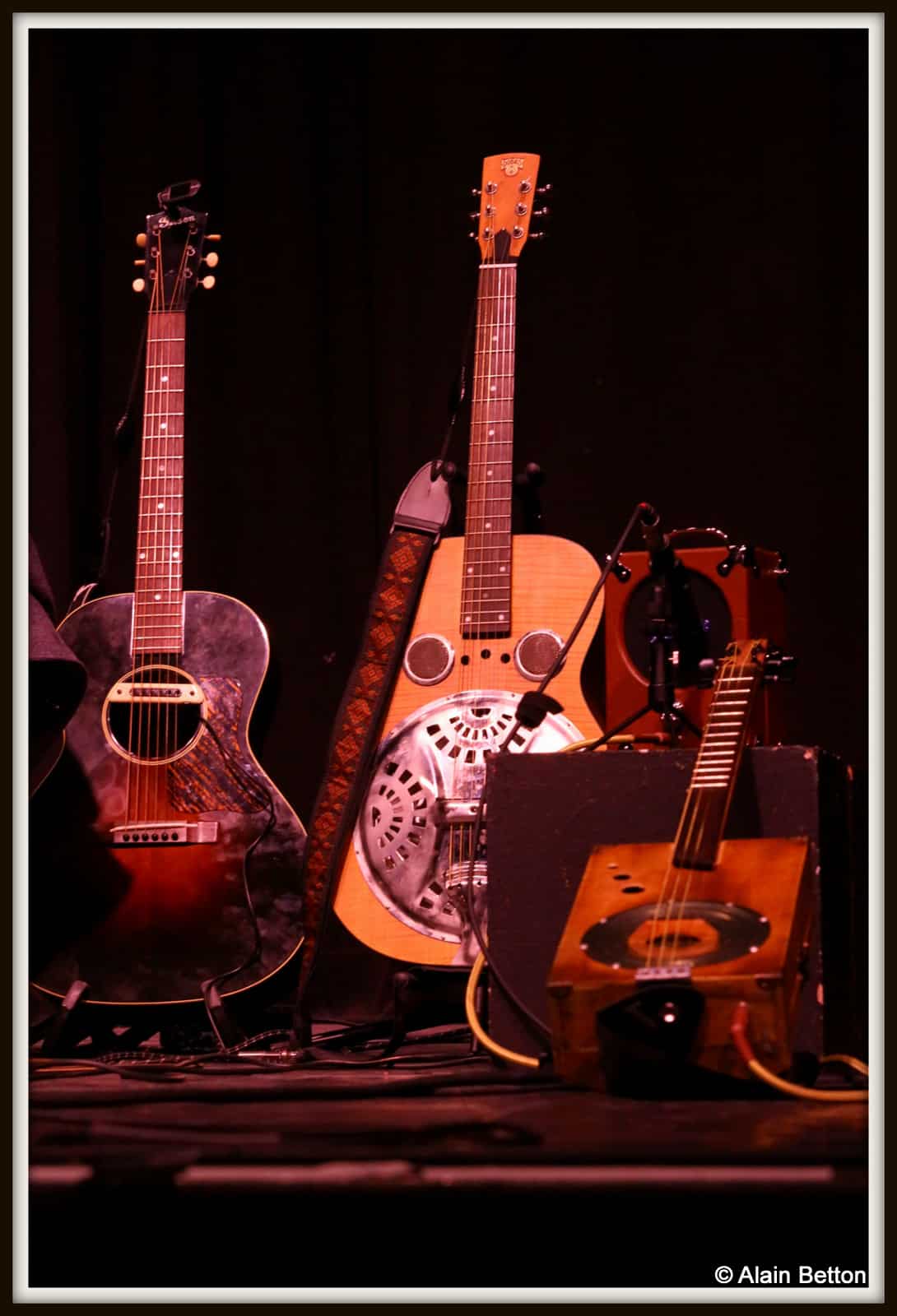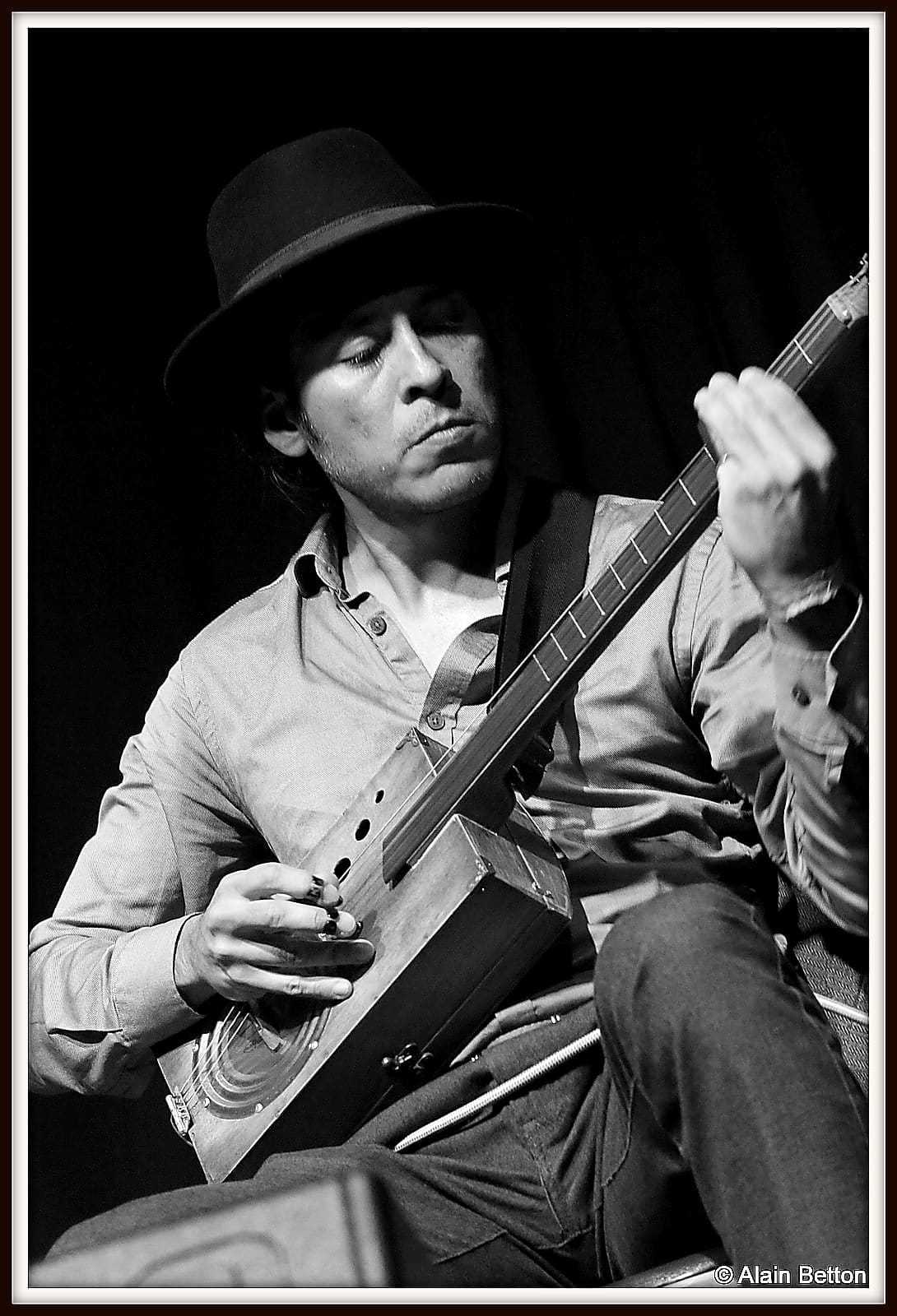 Que ce soit à la guitare, au dobro ou cigar box, expert du fingerpicking, avec en plus cette particularité de jouer avec 3 onglets aux doigts, pouce, index et majeur, que ce soit classique ou en slide, je vous l’assure, vous restez sur votre derrière tant il étonne par la fluidité et la maîtrise de son jeu.