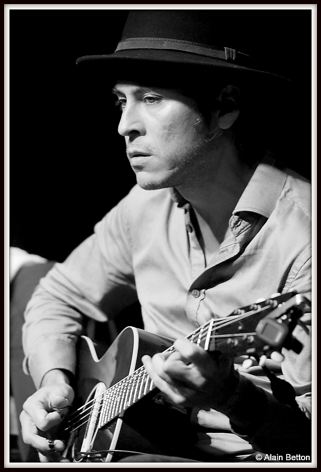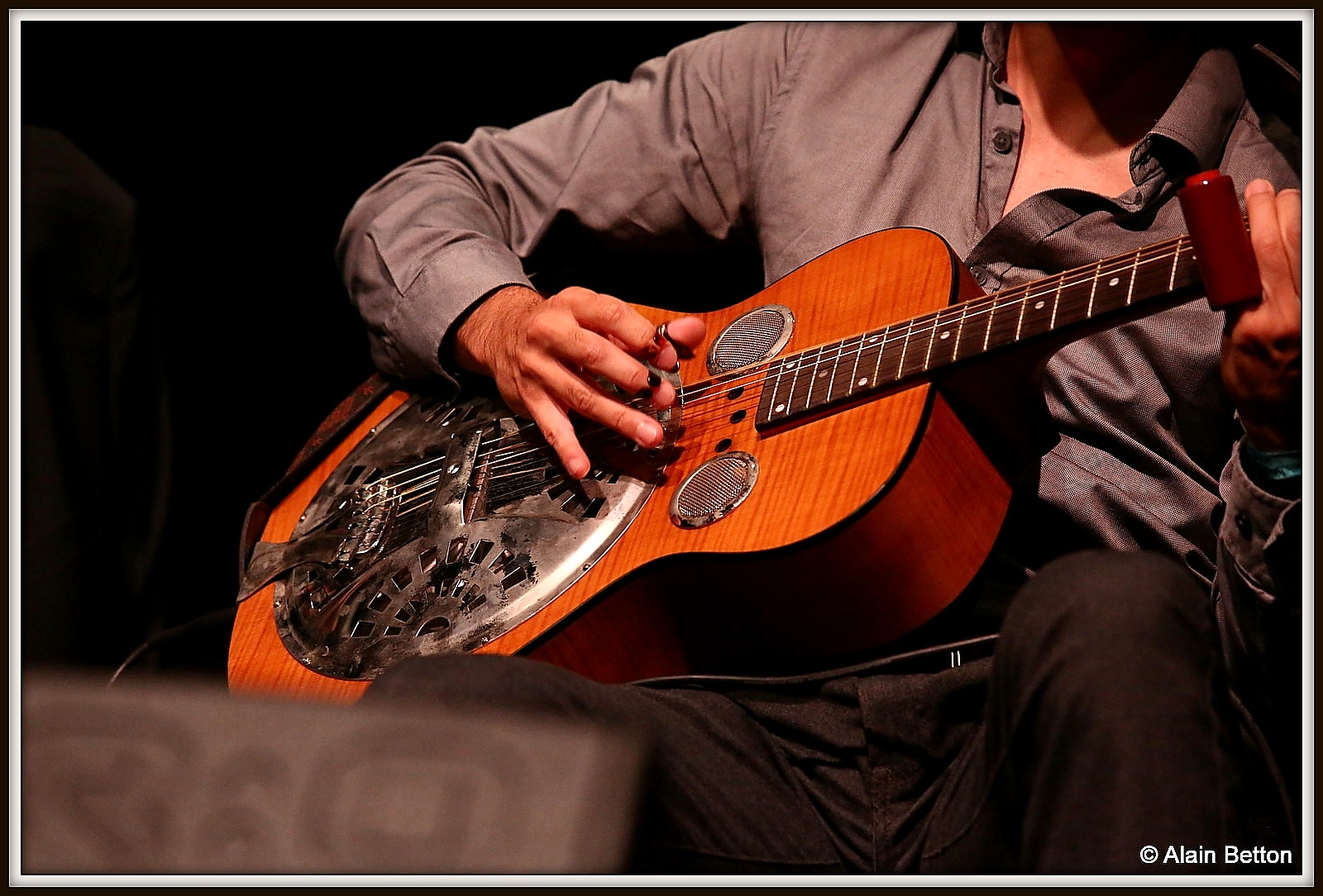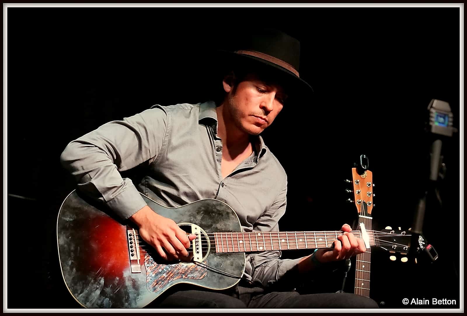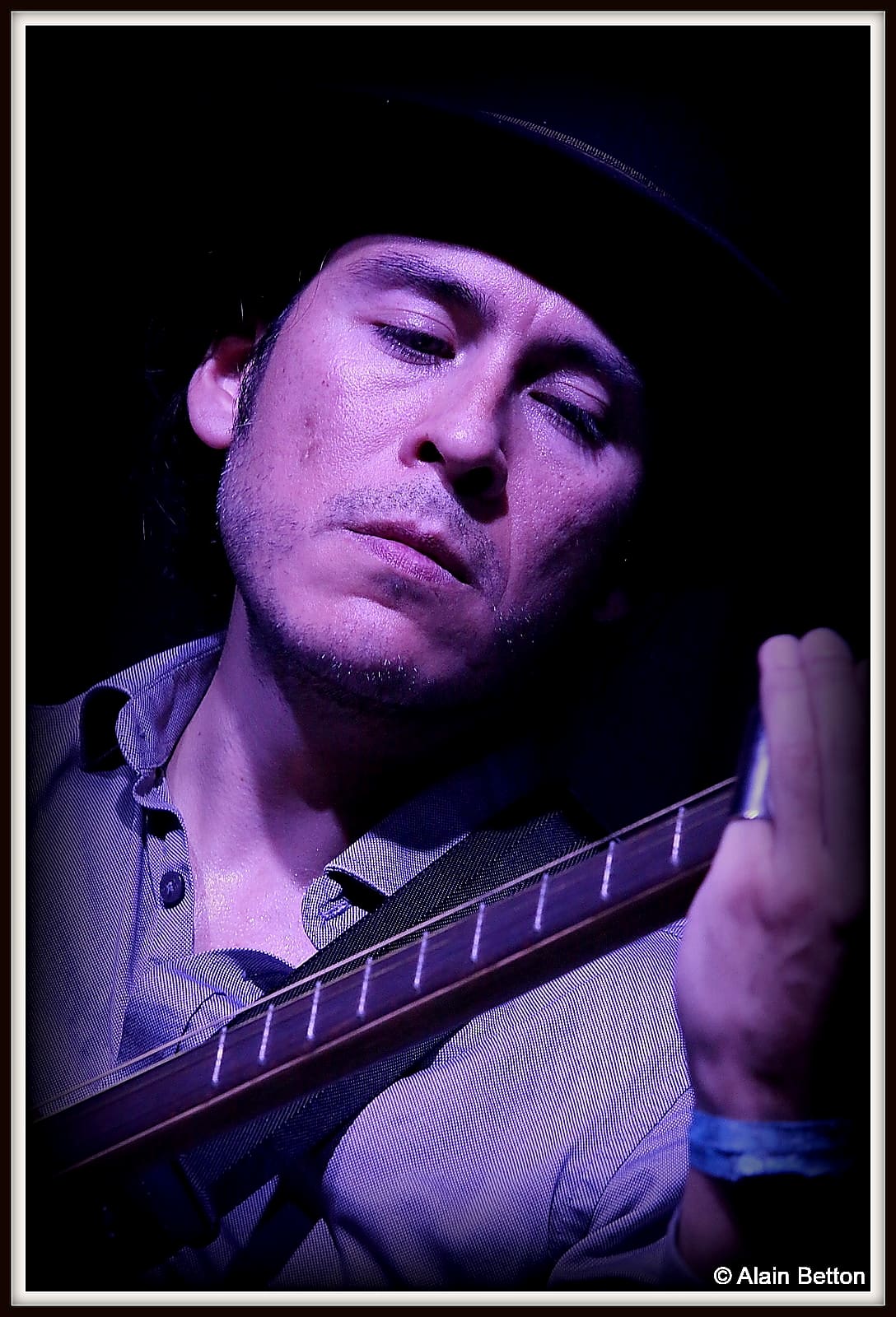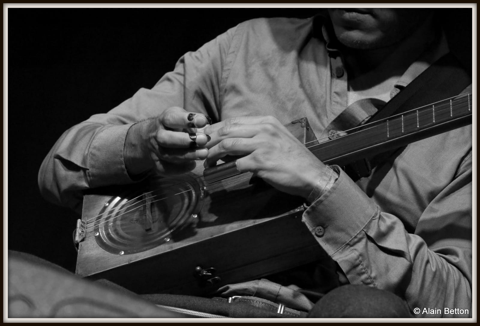 Que ce soit à la guitare, au dobro ou cigar box, expert du fingerpicking, avec en plus cette particularité de jouer avec 3 onglets aux doigts, pouce, index et majeur, que ce soit classique ou en slide, je vous l’assure, vous restez sur votre derrière tant il étonne par la fluidité et la maîtrise de son jeu.