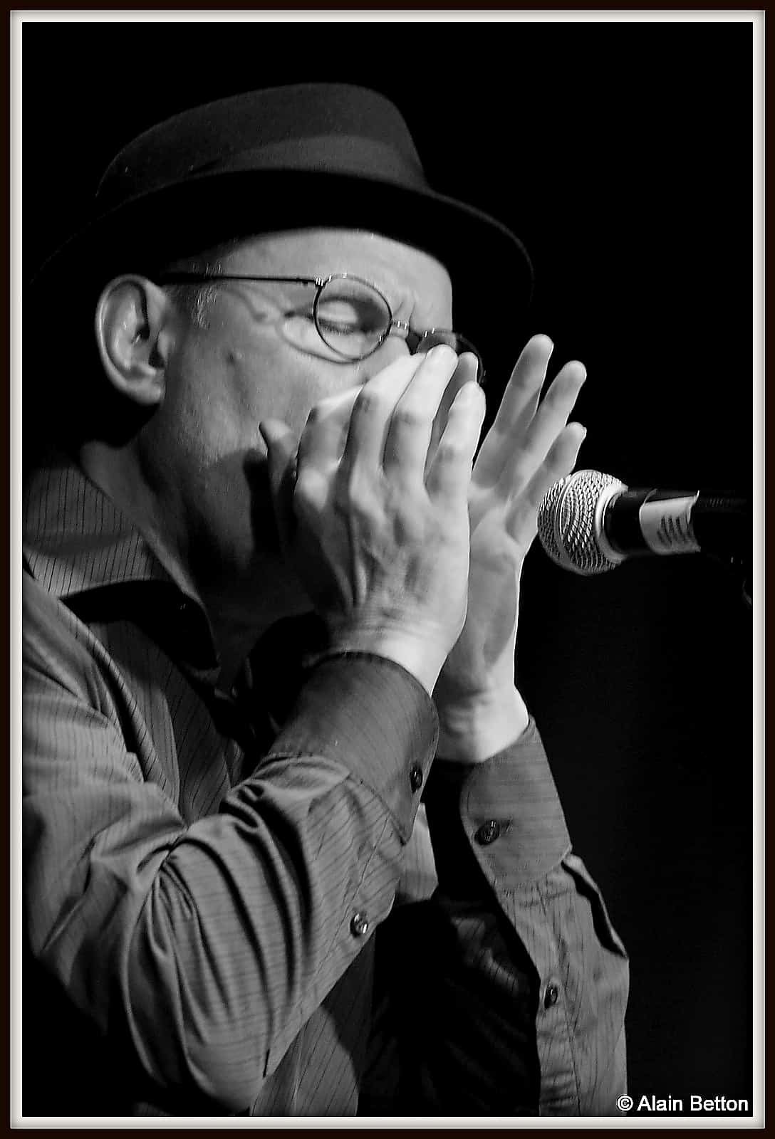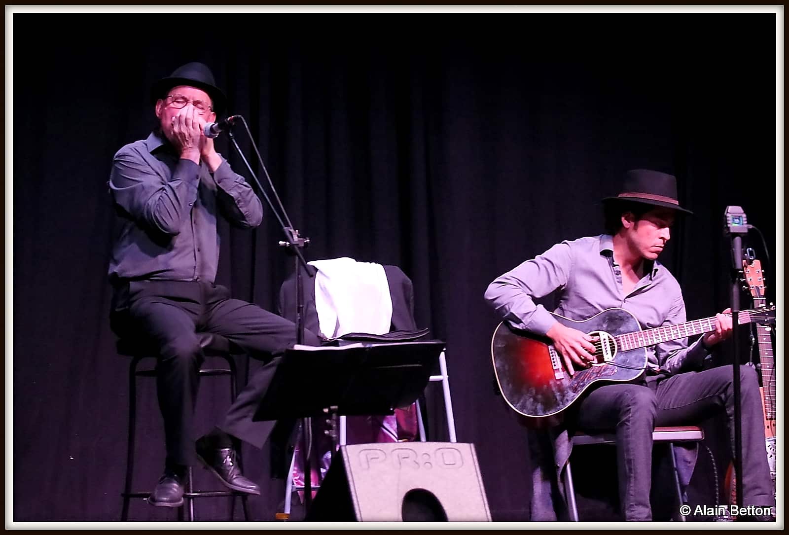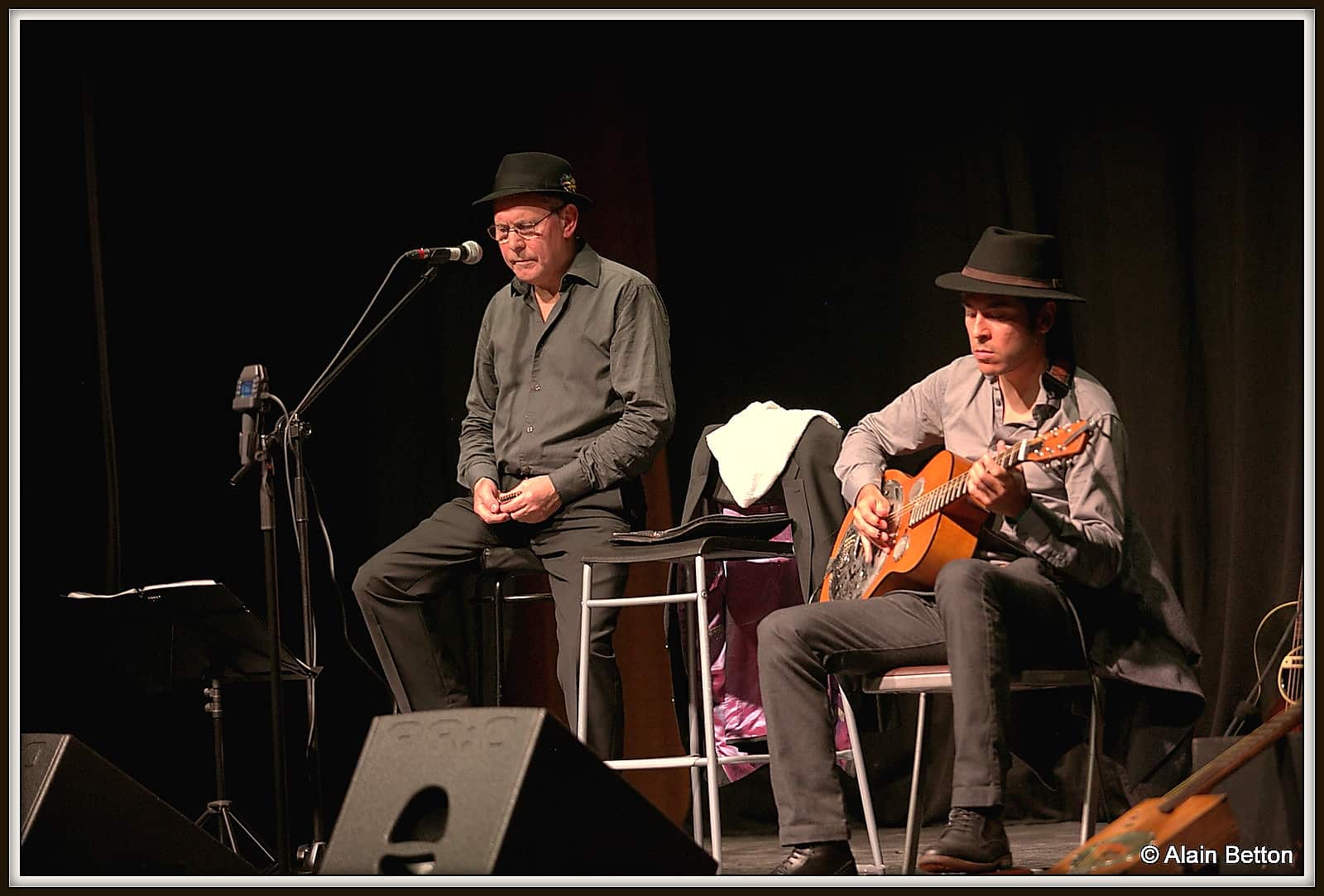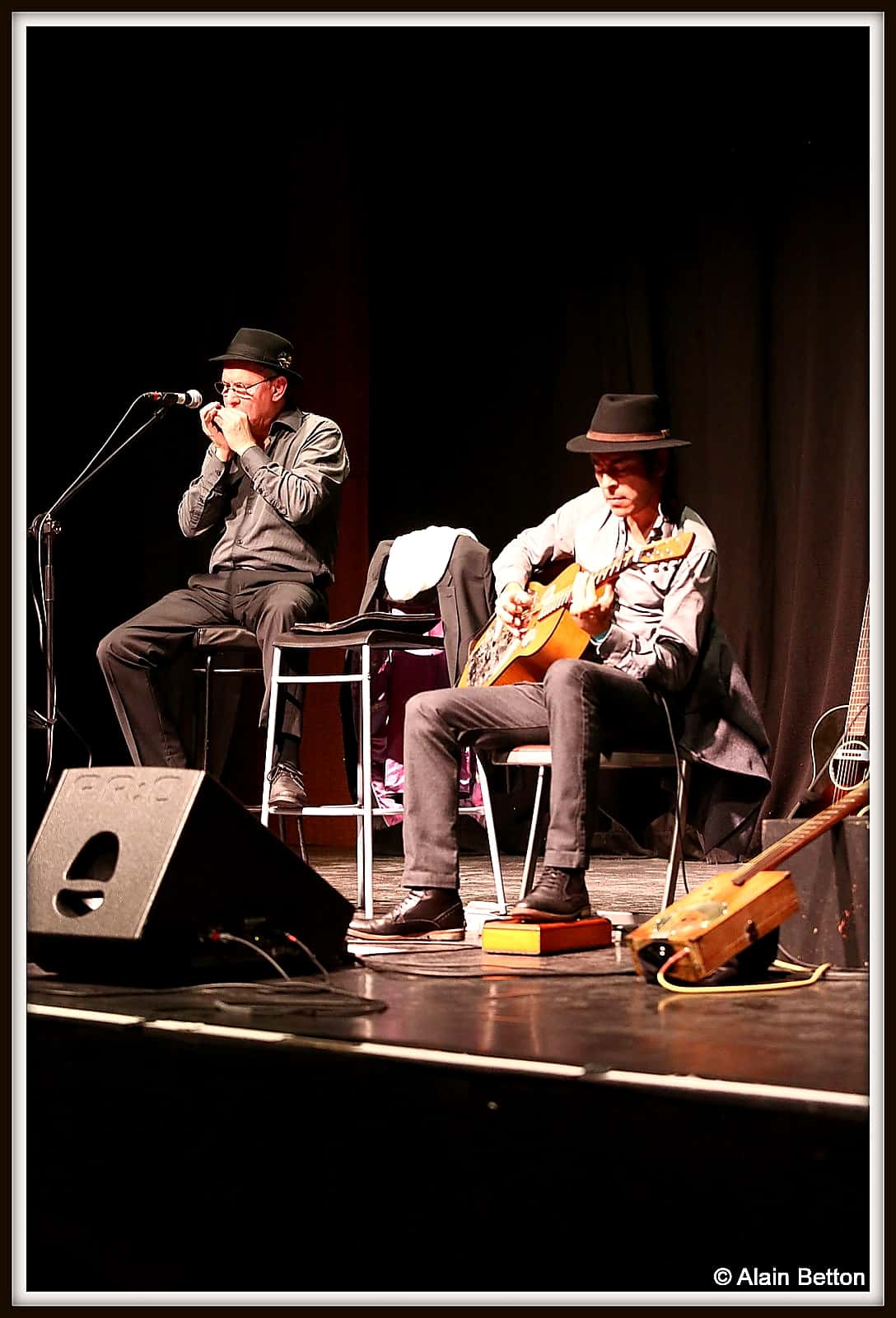 Après ce concert, durant deux jours, j’ai fouillé sur le net, j’ai dépoussiéré une partie de mes vieux albums, des CD et des compilations de certains artistes cités dans ce reportage, et d’autres encore, pour retrouver les musiques d’origine de cette époque. Ce qui m’a permis également de suivre l’évolution du Blues en écoutant les différentes reprises de nombreux titres au fil des décennies. Tout cela pour me rendre compte de l’investissement, du temps passé, du travail et du talent de Alain et Fagu. En effet, dans la majorité des titres repris par ce duo des Bluescrappers, l’harmonica n’est pas présent. Alain a donc dû l’adapter, tout comme Fagu a dû s’investir pour conserver l’authenticité et l’âme de cette musique dite du diable. Alors, Alain et Fagu, même si vos couvre-chefs font de l’ombre pour les photos, je vous dis “Chapeaux les artistes!”. Vous méritez amplement de jouer non seulement dans ces ‘petits’ festivals de Blues qui font le bonheur du public dans l’hexagone, mais aussi, je vous le souhaite de tout coeur, dans ces grands festivals où les formations comme la vôtre sont trop souvent oubliées, voire écartées.