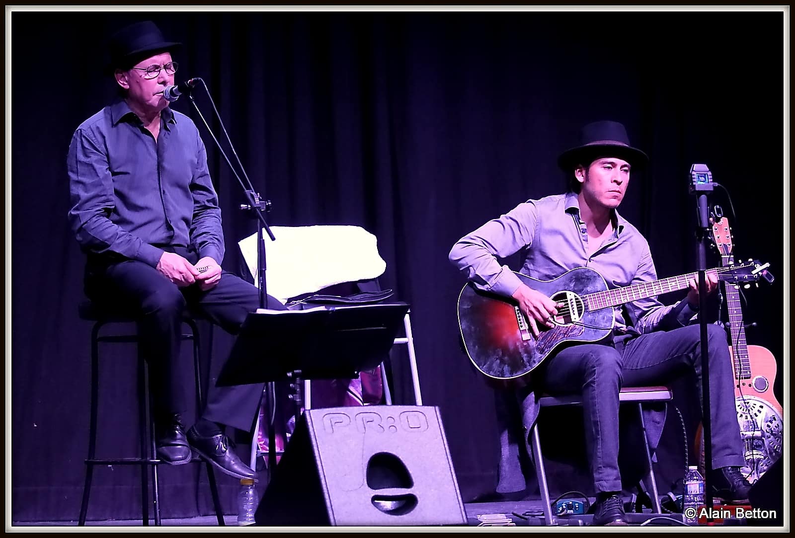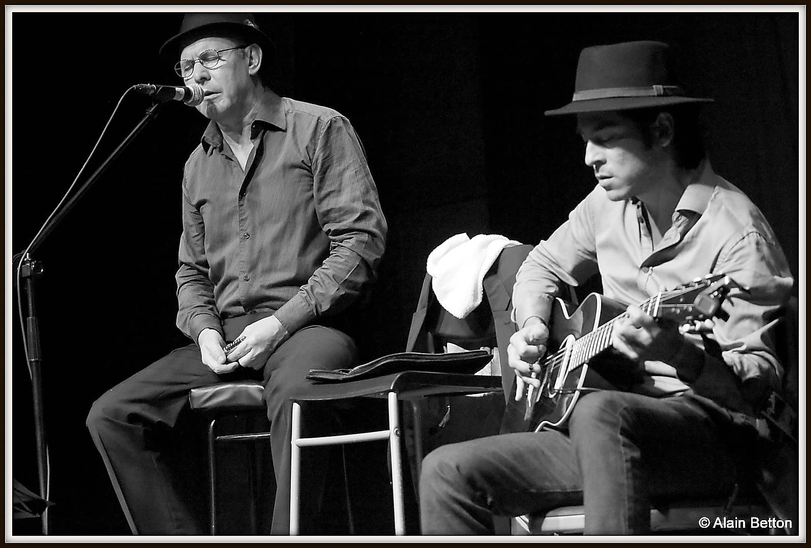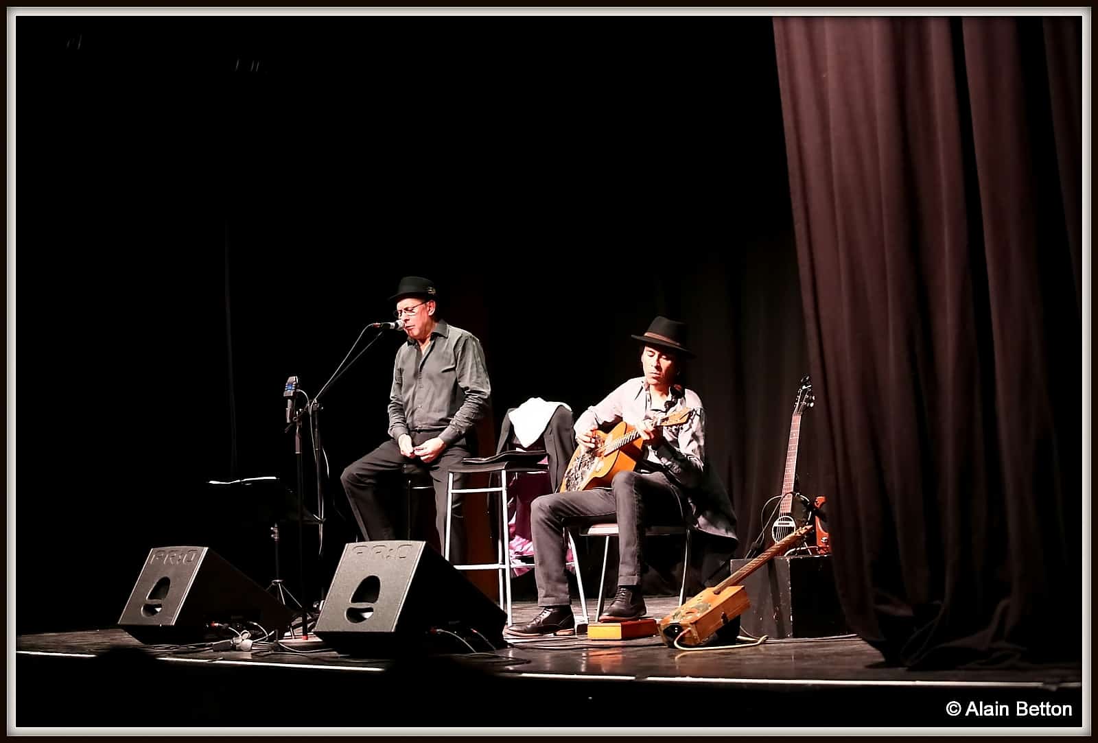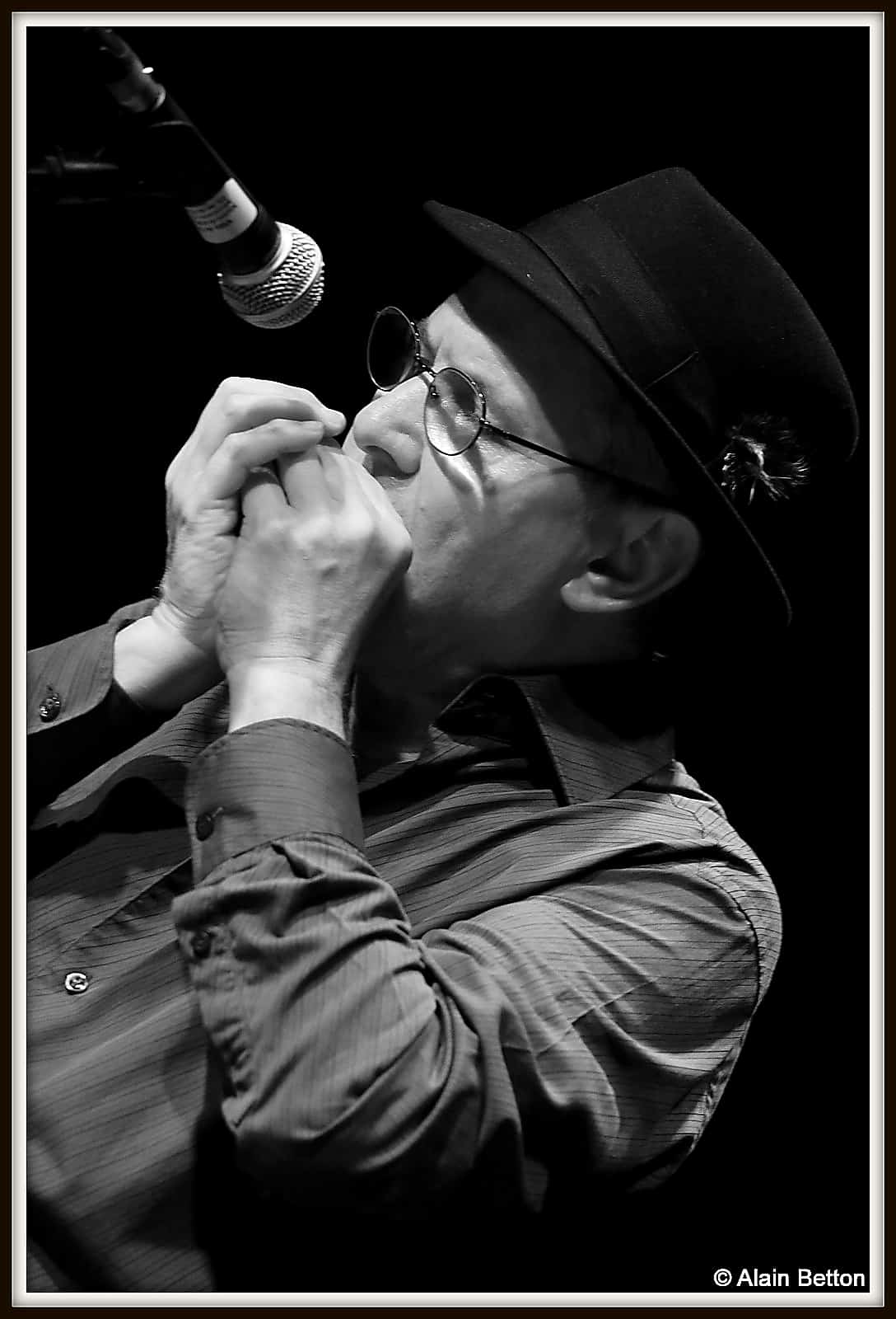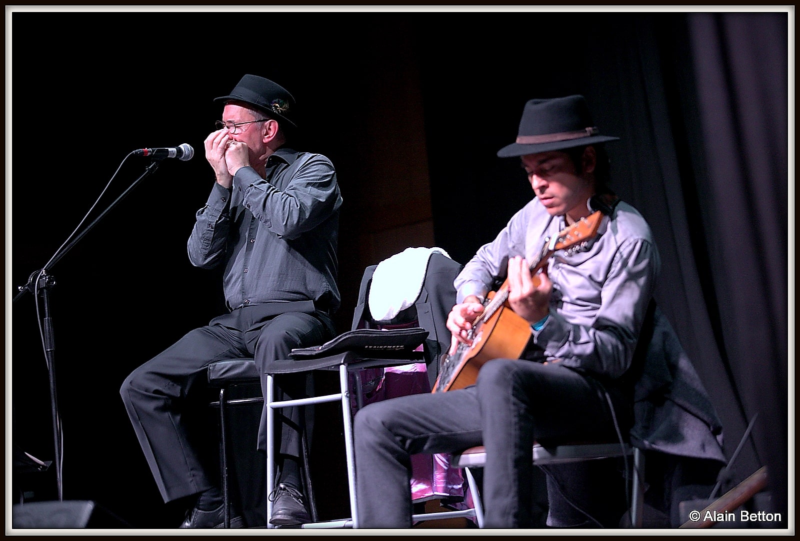 Après ce concert, durant deux jours, j’ai fouillé sur le net, j’ai dépoussiéré une partie de mes vieux albums, des CD et des compilations de certains artistes cités dans ce reportage, et d’autres encore, pour retrouver les musiques d’origine de cette époque. Ce qui m’a permis également de suivre l’évolution du Blues en écoutant les différentes reprises de nombreux titres au fil des décennies. Tout cela pour me rendre compte de l’investissement, du temps passé, du travail et du talent de Alain et Fagu. En effet, dans la majorité des titres repris par ce duo des Bluescrappers, l’harmonica n’est pas présent. Alain a donc dû l’adapter, tout comme Fagu a dû s’investir pour conserver l’authenticité et l’âme de cette musique dite du diable. Alors, Alain et Fagu, même si vos couvre-chefs font de l’ombre pour les photos, je vous dis “Chapeaux les artistes!”. Vous méritez amplement de jouer non seulement dans ces ‘petits’ festivals de Blues qui font le bonheur du public dans l’hexagone, mais aussi, je vous le souhaite de tout coeur, dans ces grands festivals où les formations comme la vôtre sont trop souvent oubliées, voire écartées.