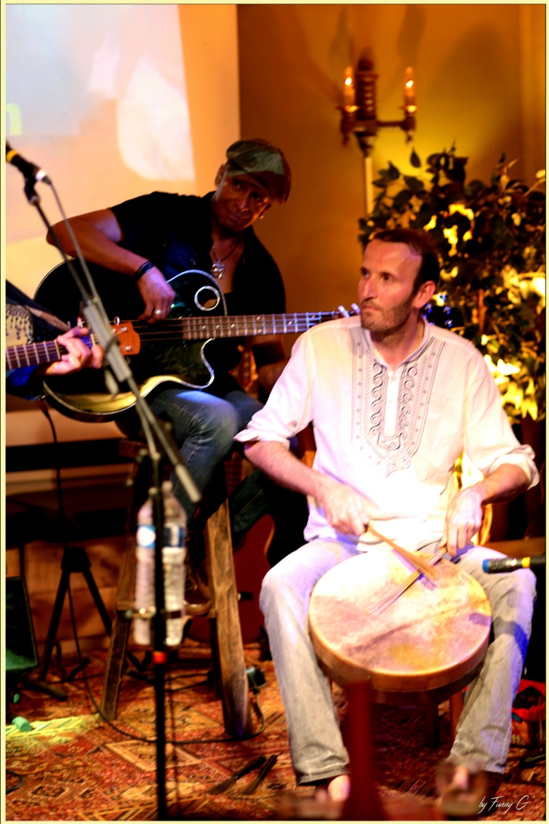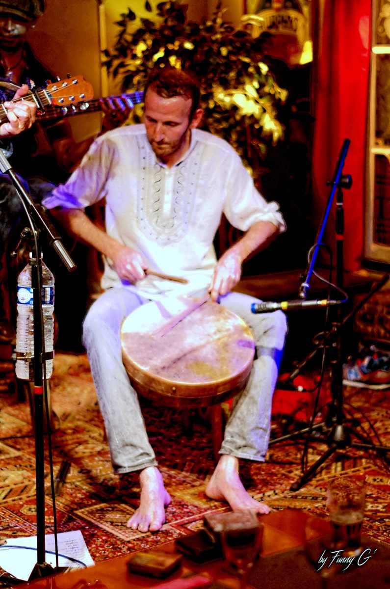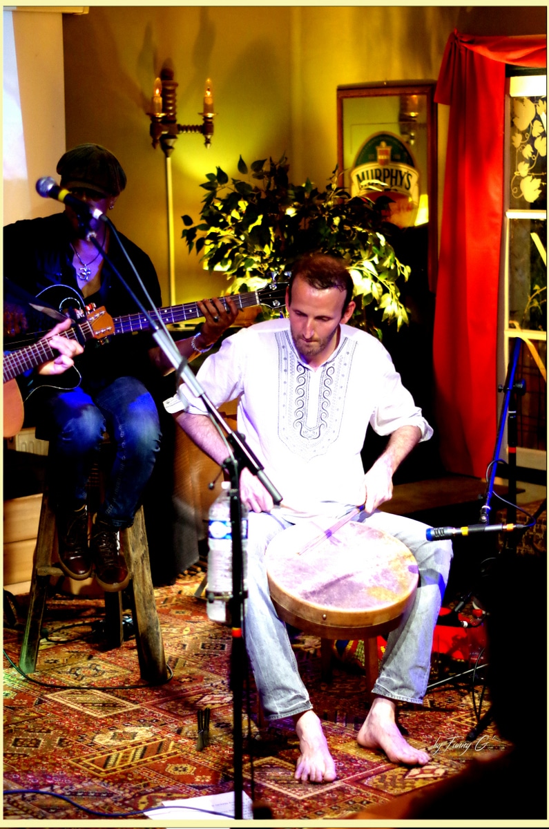 Nadir Babouri, pour sa part, est arrivé avec des sonorités chaudes nées de son BENDIR, tambourin algérien qui se joue avec les doigts comme avec les mains, des baguettes, des balais, pour donner un souffle différent aux compositions et covers d’Eric TER.