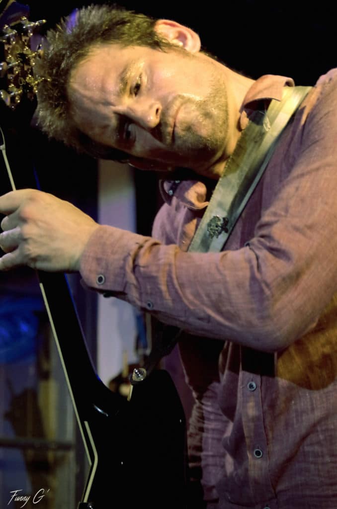 Donc c’est dans la place que jouait Brice Delage, guitariste émérite et chanteur qui incarne avec un grand brio ses interprétations, talentueux maître dans sa discipline “guitaristique”, à propos de qui j’ai souhaité m’exprimer avec des images, en même temps que de son groupe!