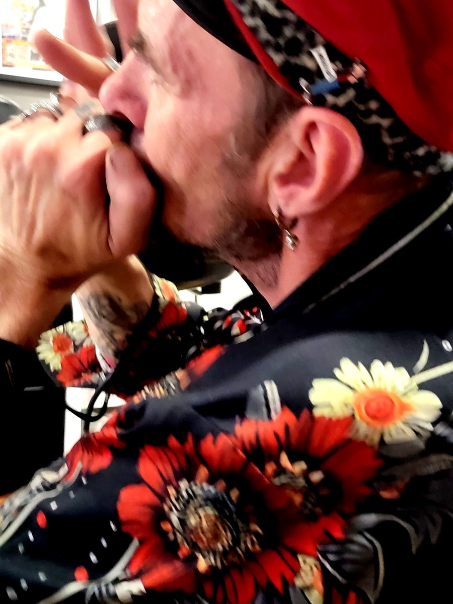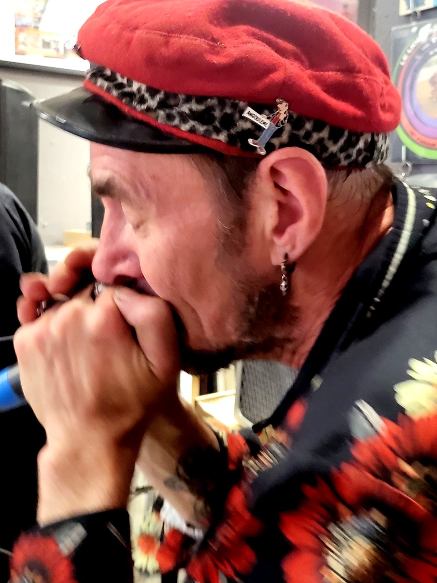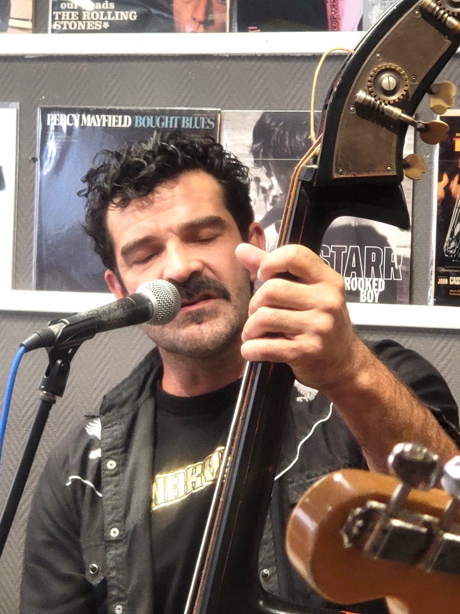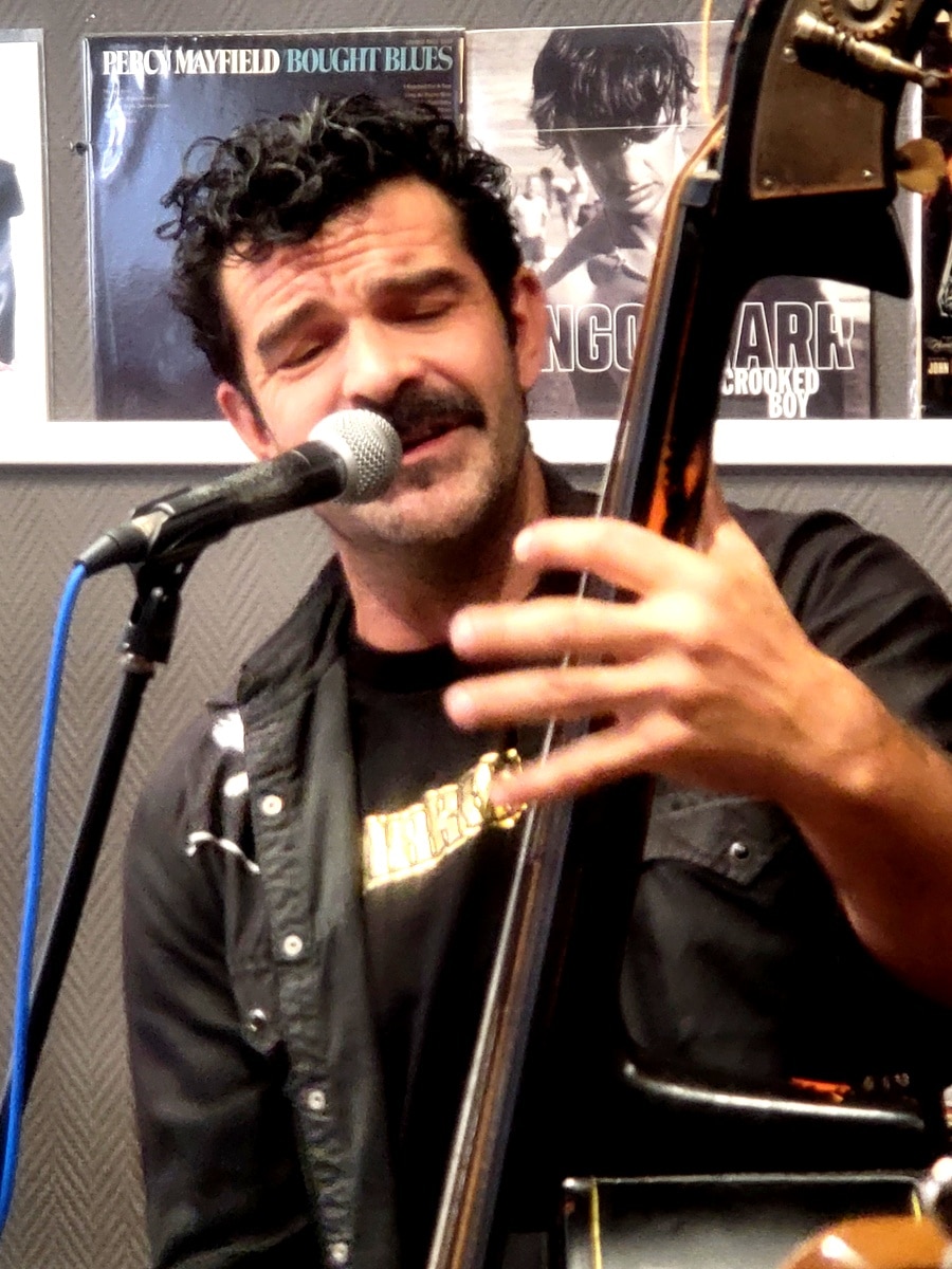 Ponctuels et en parfaits professionnels, malgré la fatigue de la Fête de l’Huma et de ses afters d’épicuriens, aussi assoiffés qu’un lévrier afghan après une course sur cynodrome et leur emploi du temps aussi overbooké que celui d’un marchand de kébabs au métro Robespierre, le showcase pouvait alors démarrer sous les meilleurs auspices, malgré une formation réduite, car malheureusement, le guitariste Ronan Drougard (Rön Droogish), juste passé faire un petit coucou, ne pouvait pas rester. Le line up était le suivant: Johnny Montreuil au chant et à la contrebasse, Steven Goron (Visten Fatcircle) à la caisse claire et aux percussions, Kik Liard à l’harmonica et au tambourin (retrouvez ICI l’interview croisée de Johnny Montreuil & Kik Liard), et Marceau Portron à la guitare électrique. Et je peux vous certifier que ça tourne comme une horlogerie suisse, et que Johnny, malgré son pacifisme légendaire, tient-là une véritable machine de guerre.