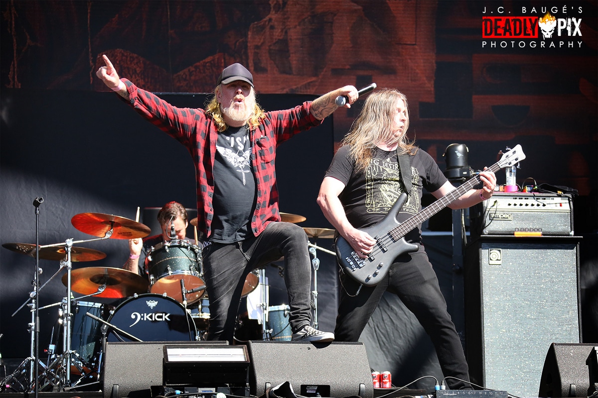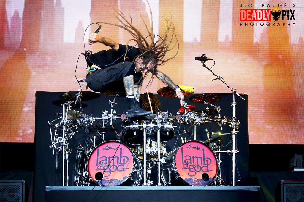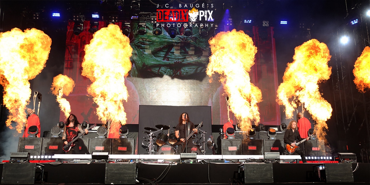 Dans le Grote Kaai transformé en dôme du tonnerre, deux régionaux d’étape remettent la batterie au centre des débats: SLOPER, avec la bataille rangée entre Mario Goosens (Triggerfinger) et Cesar Zuiderlijk (Golden Earring, comme le rappelle le caméo de “Radar Love”) sur une grosse caisse commune, et BRUTUS, starring la meneuse d’hommes Stefanie Mannaerts. Entre deux, AT THE GATES rappelle qu’il est le cogéniteur du death metal mélodique suédois avec Dark Tranquillity et In Flames, qui ont en commun de s’être fait damer le pion par Arch Enemy en termes de succès commercial. Les premiers tourbillons de poussière s’élèvent du pit, séparé en deux sur ordre de Mille Petrozza, chanteur/ guitariste de KREATOR qui brandit lui-même le “flag of hate”. Sur scène, flammes (“Violent Revolution”) et jets de CO2 (“Strongest Of The Strong”, dédié à la tête d’affiche du jour) viennent lécher pendus et trépanés. Les mésaventures de Randy Blythe en Tchéquie, arrêté pour coups et blessures volontaires en 2012, semblent bien loin: le chanteur de LAMB OF GOD a désormais toute latitude pour opiner du chef, dreadlocks au vent, et promouvoir l’album Omens avec deux mois d’avance… et uniquement son morceau-titre!