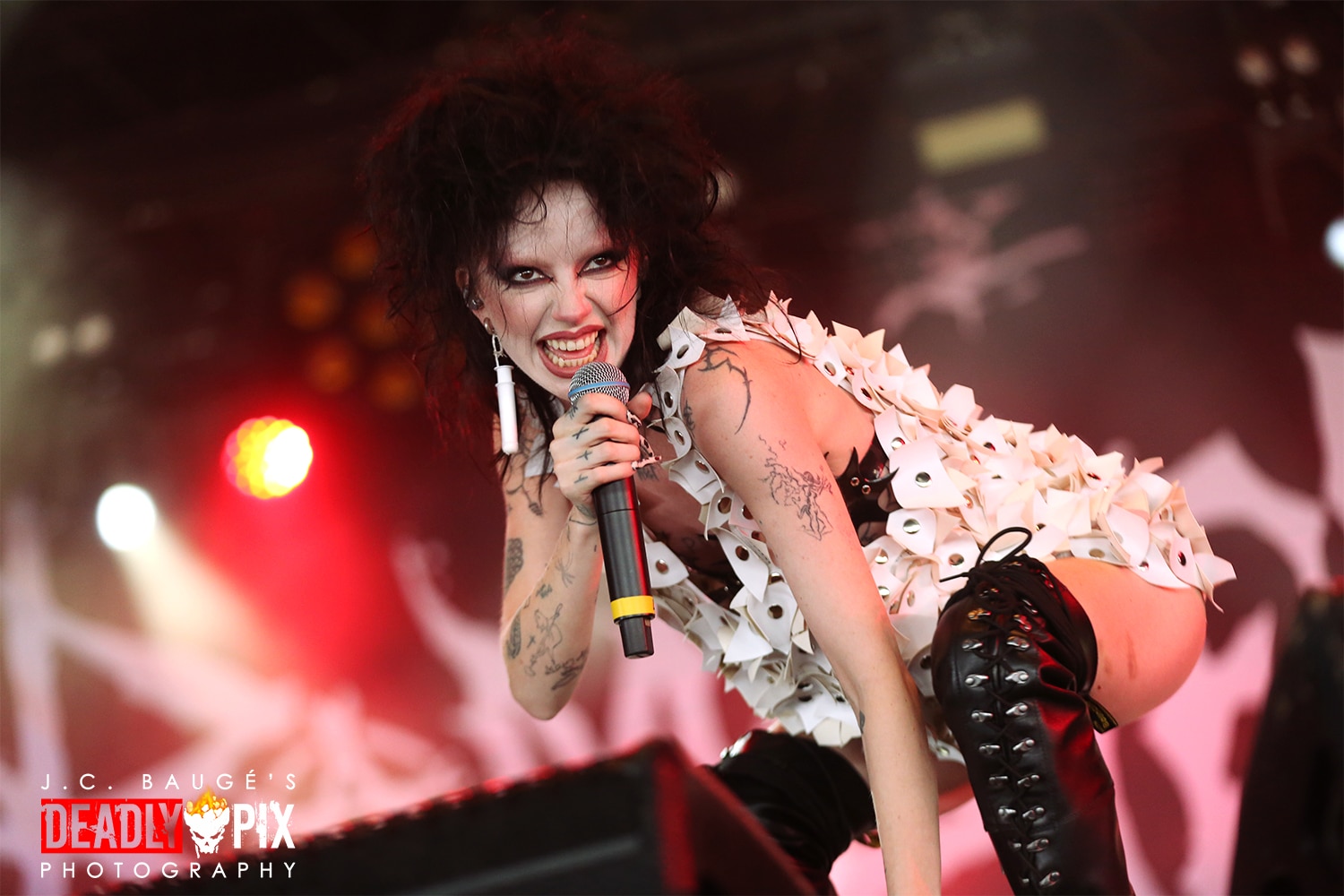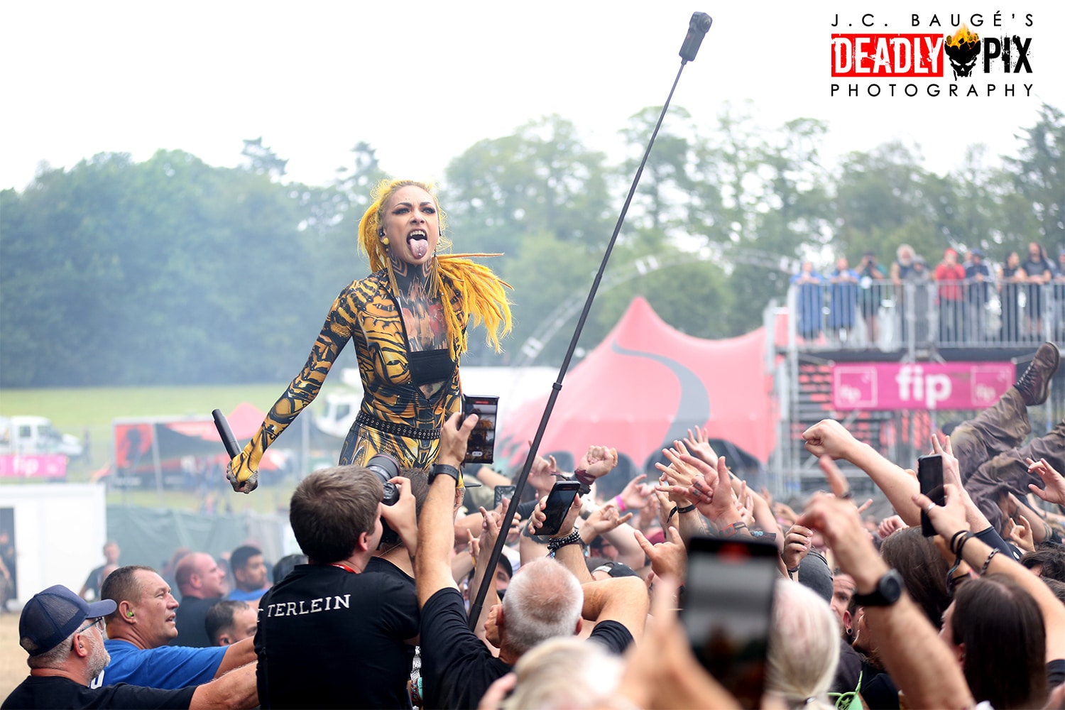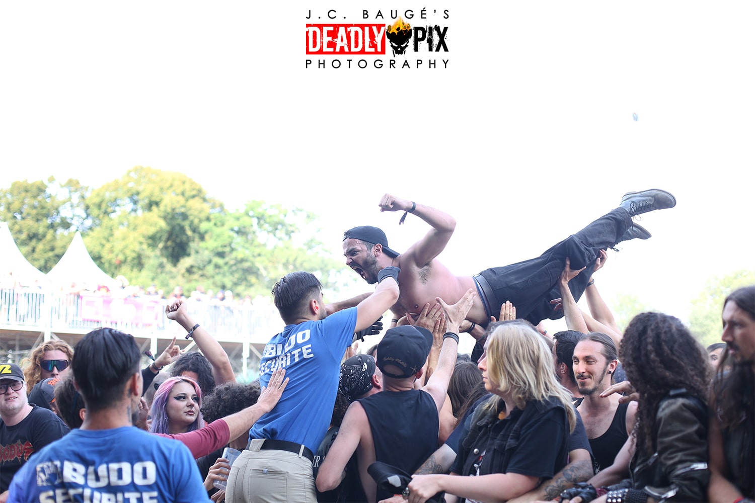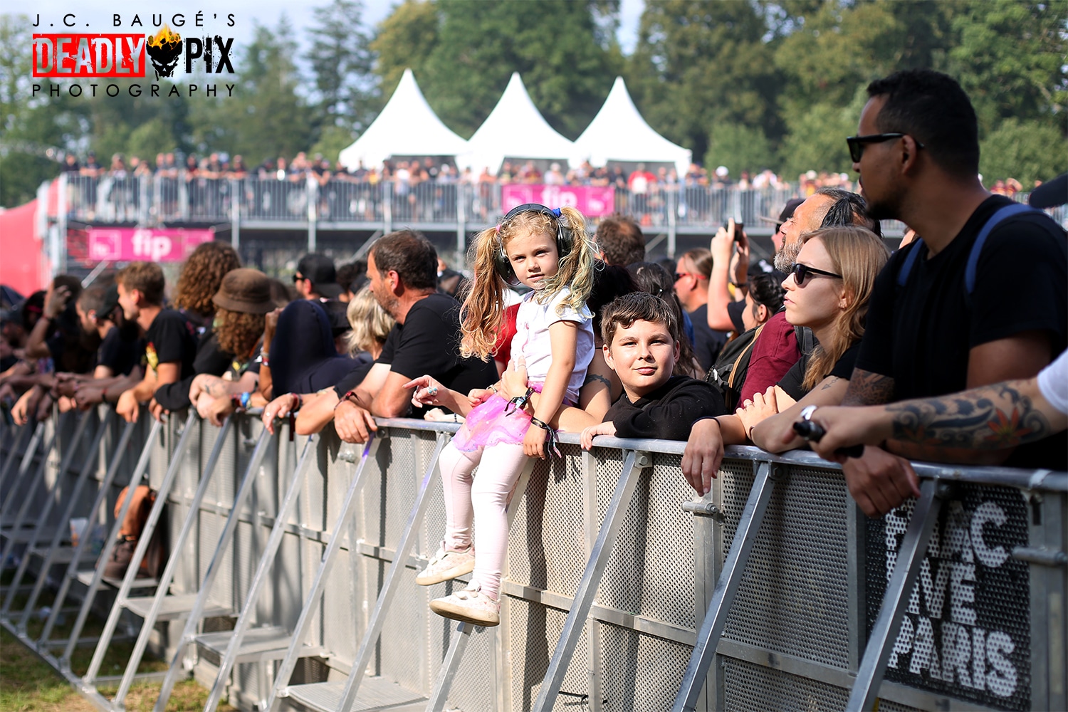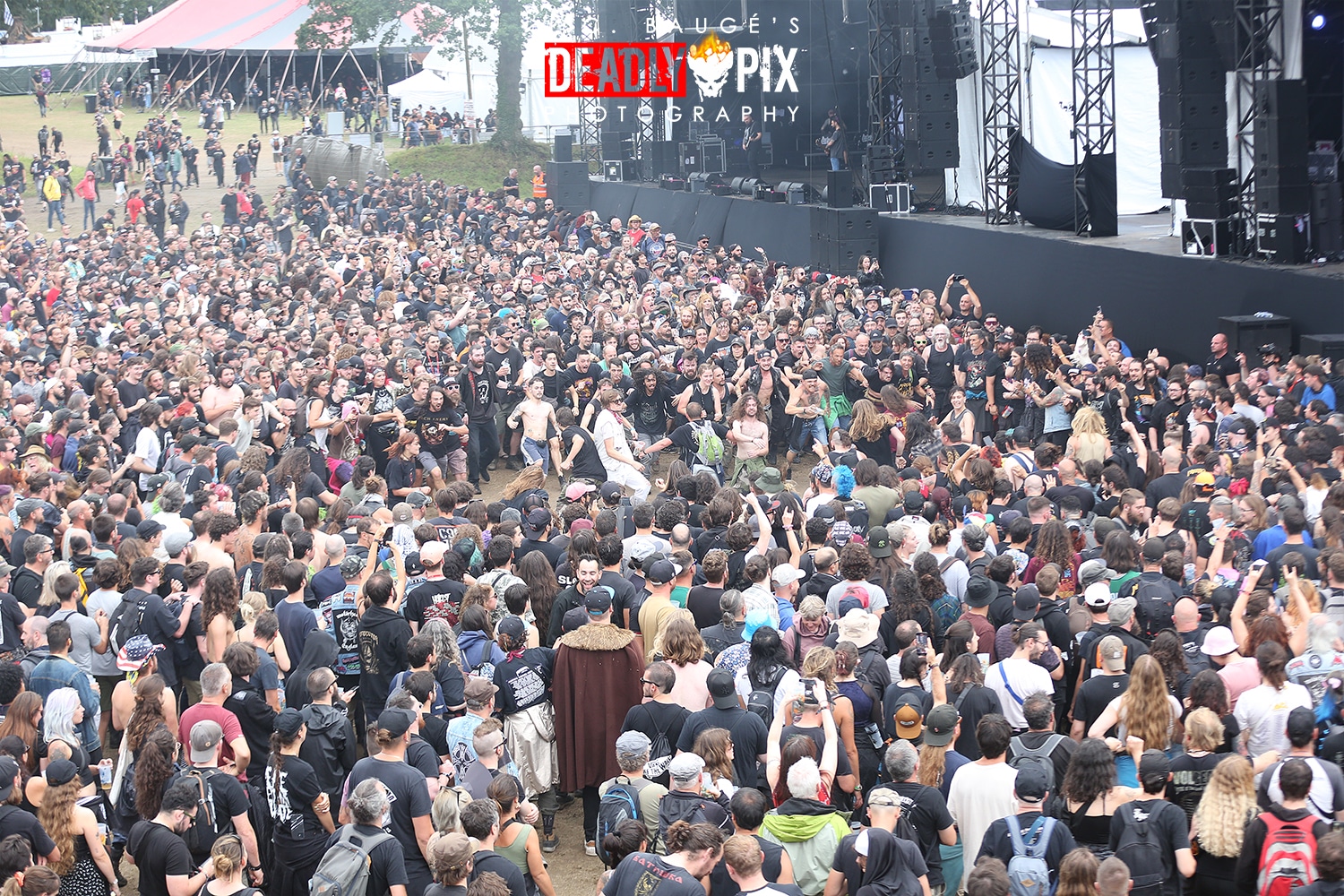 “A tous les boloss avec les T-shirts FAF (NDLR: acronyme de France Aux Français), cassez-vous”: sous l’œil enamouré de ses patrons du label Frozen Records, Dominique Lucas, demi-lettré fanatisé de SORCERER, prêche urbi et orbi l’évangile selon Saint Jean-Luc. On retrouve le même entrisme à visée d’endoctrinement sous le stand des associations Nous Toutes 29 et Poulettes L’Assaut, dames patronnesses qui, à défaut de faire leur examen de conscience (erreur 404 dans l’affaire Lola), jouent au chamboule-tout avec des boîtes à l’effigie de coupables… d’être accusés de violences sexistes et sexuelles (Till Lindemann et al.)! Les cinquante minutes de chorégraphie léchée des quatre idoles japonaises de BROKEN BY THE SCREAM suffiront-elles à trancher dans le running order: JINJER, ambassadeur officiel du “fuck the war” sur la Dave Mustage, ou BERNARD MINET, batteur “nostalgeek” des Musclés sur la Bruce Dickinscène? Enchantés par les merguez gonflables (“Merguez Partie”) tels les enfants d’Hamelin par le flûtiste revanchard, nous rejoignons la “Fête Au Village”, forcément régressive, avec la section rythmique d’Ultra Vomit, et rendons un dernier hommage à Claude “Framboisier” Chamboissier puis René Morizur, garanti “100% de Brest”. Yusaf “Vicotnik” Parvez (DØDHEIMSGARD), enhardi par les vapeurs d’encens, échappe de peu à l’accident en hauteur des structures supportrices de sa scène, démontrant qu’il est encore béni des dieux du black metal norvégien. ARCHITECTS, tête d’affiche à la force de frappe insoupçonnée, rejoue le théâtre d’ombres devant deux murs d’écrans LED ayant considérablement restreint l’espace vital des groupes de première partie… et une marée humaine de loin la plus dense des quatre jours.
