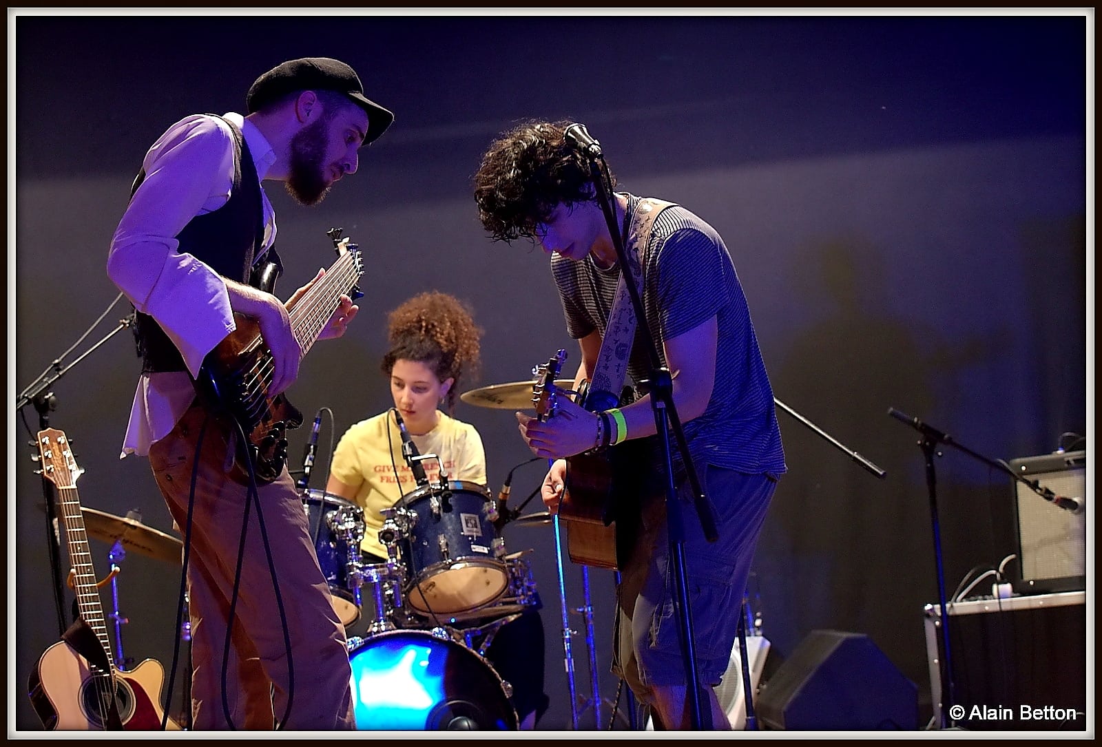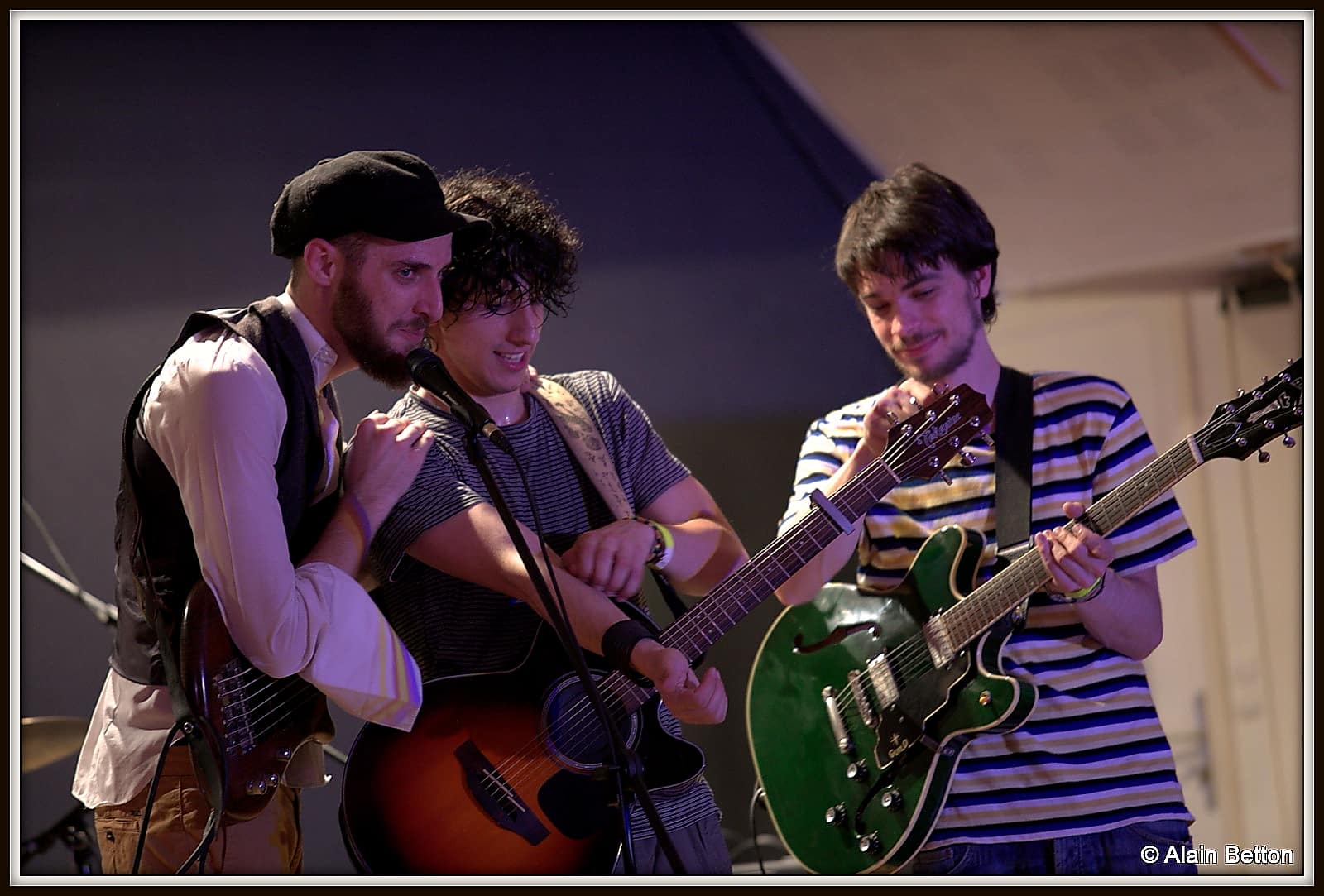 La complicité est extrême entre ces quatre musiciens, tout comme l’est d’ailleurs une forte et belle présence scénique. Le show est assuré. Ricardo Morgante, les yeux pétillants et sourire aux lèvres derrière son micro, s’adresse au public, debout ou agenouillé, il est partout à la fois. Il s’empare de sa Takamine lorsque la guitare le démange, se contorsionne devant Doriane amusée, ou fait face à ses deux compères respectivement à la basse et à la guitare électrique, comme pour une joute malicieuse et jubilatoire.