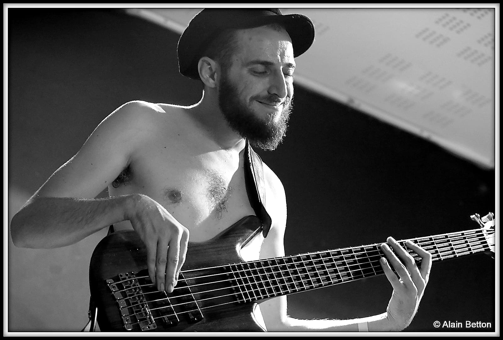 Guillaume Varache et Simon Guiganti, respectivement bassiste et guitariste de Babayaga, vont d’emblée ‘tomber la chemise’ car il fait très chaud dans le salle, et plus encore sous les spots, sur scène. Guillaume et Simon font partie des musiciens que non seulement nous écoutons mais également que nous regardons jouer, car tous deux sont fascinants. Guillaume esquissant quelques pas de danse, triturant les cordes de son instrument avec mimiques à l’appui, totalement dans son trip est non seulement un sorcier à la basse, mais également le ‘gardien du temple’ sur lequel ses complices peuvent totalement s’appuyer.