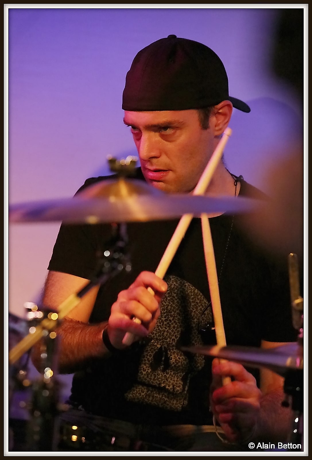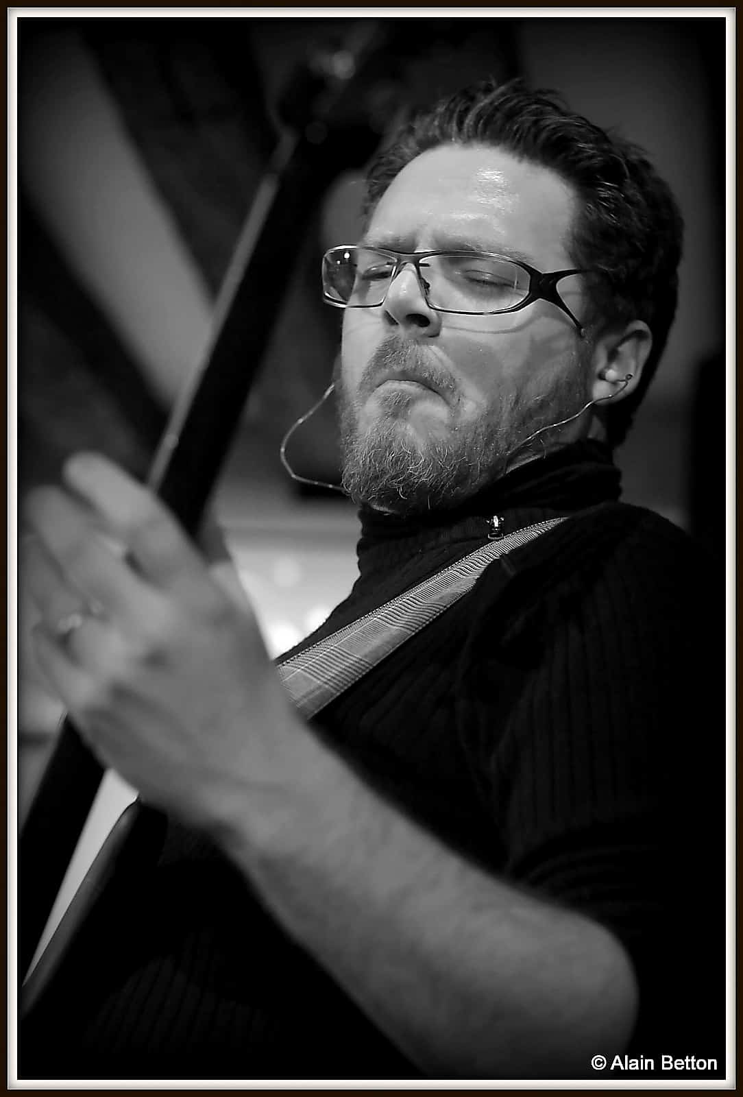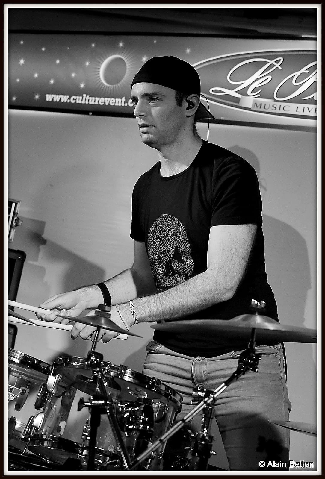 Retour sur la scène du Pitchtime, car aux côtés de Pat, la bouillante rythmique n’est pas là pour faire de la figuration, mais plutôt pour envoyer du lourd. Aurélien Ouzoulias jongle avec ses baguettes et frappe les fûts avec une impressionnante dextérité, en parfaite complicité avec Julien Lambert, bien campé sur scène, avec quelques facéties gestuelles pour être au plus proche public, avec son jeu de basse tout en rondeurs et délicatesse. Aurélien et Julien ne sont pas les musiciens attitrés de Pat O’May, mais je dirai, au vu de leur performance durant cette soirée, que le talent ne s’invente pas, il est inné!