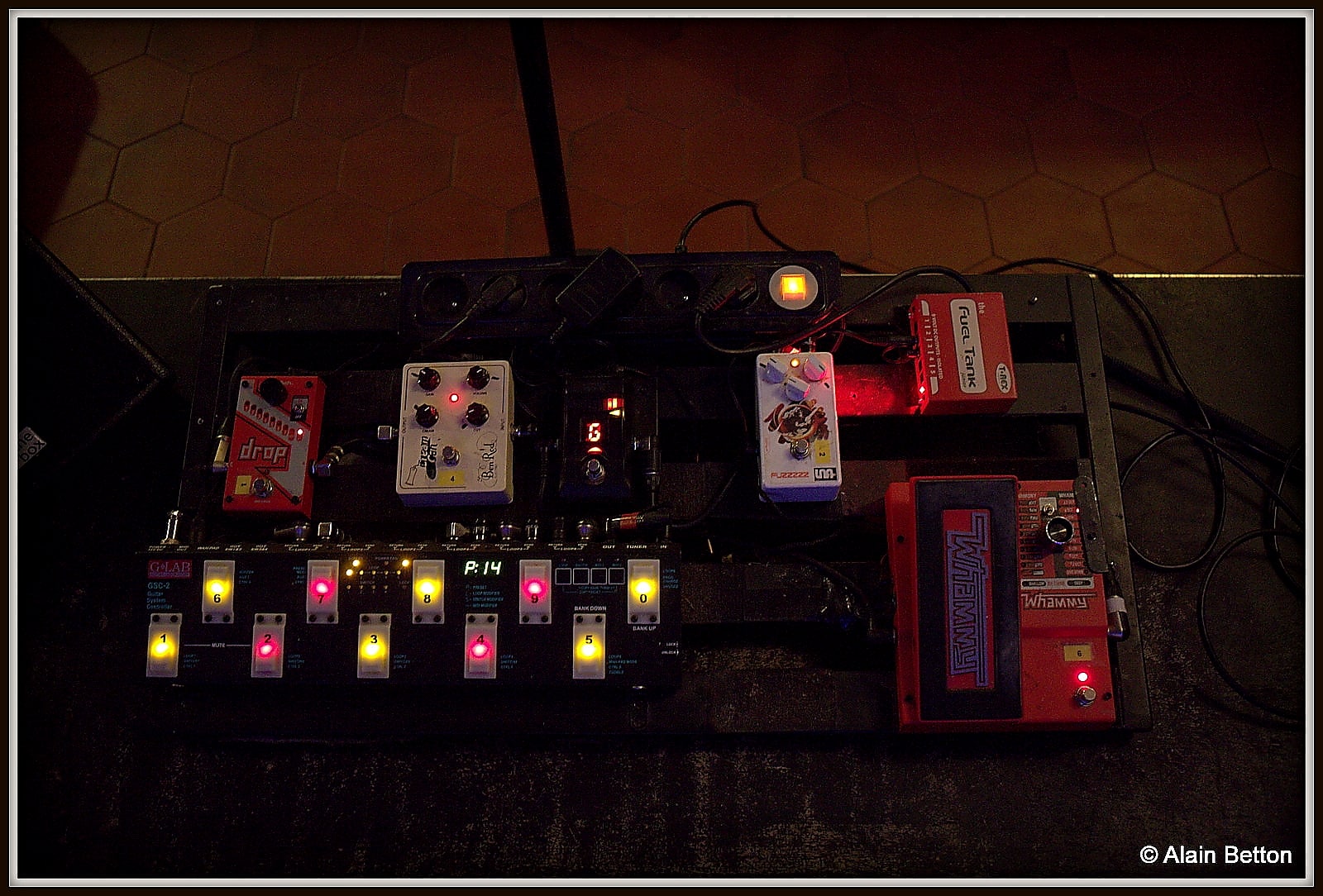 Profitons de cette petite pause entre deux sets, pour faire un arrêt sur image sur le pédalier de Pat et de sa superbe guitare, cette Lâg signature Arkane Celtic Master de fabrication française.