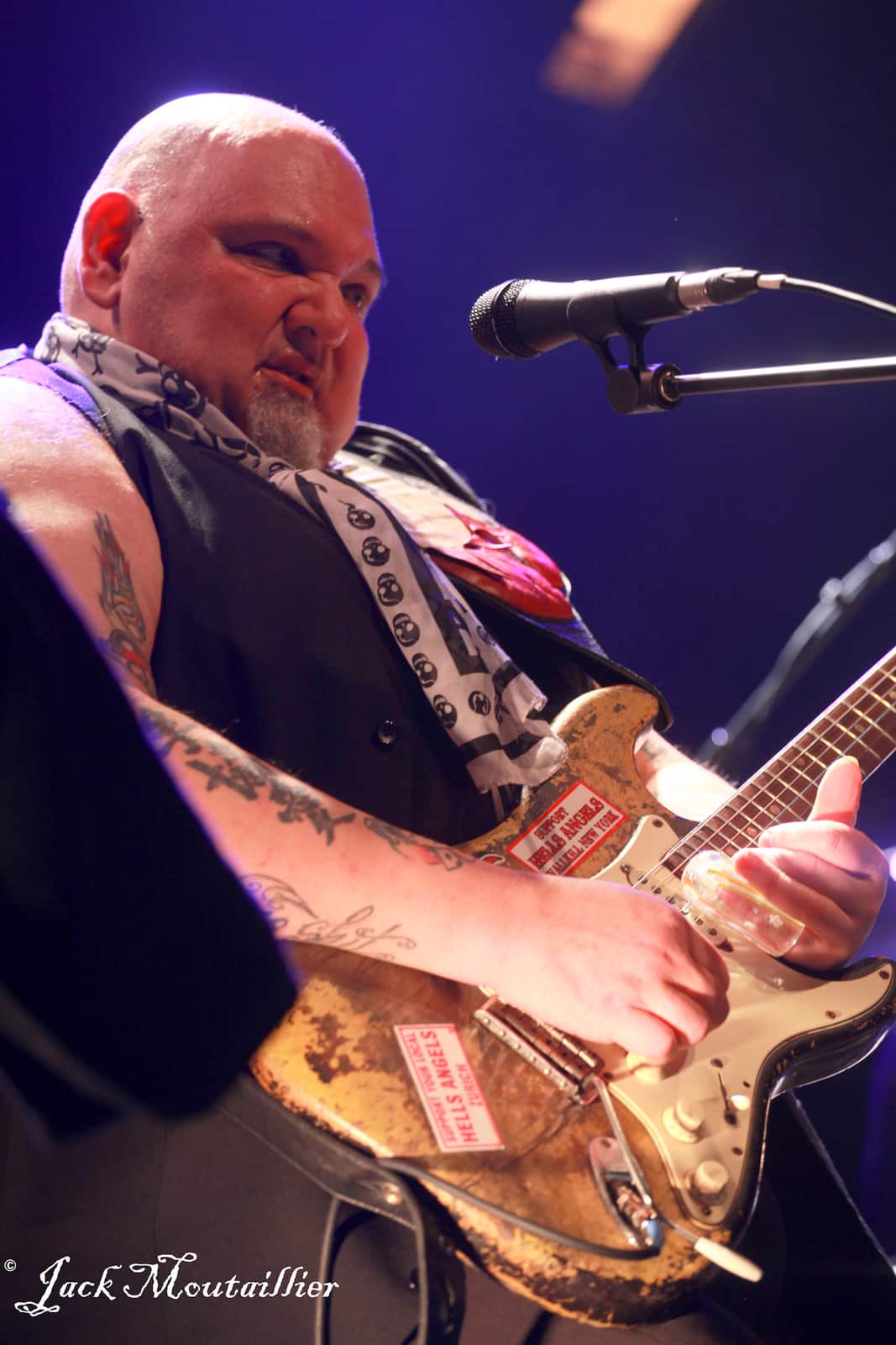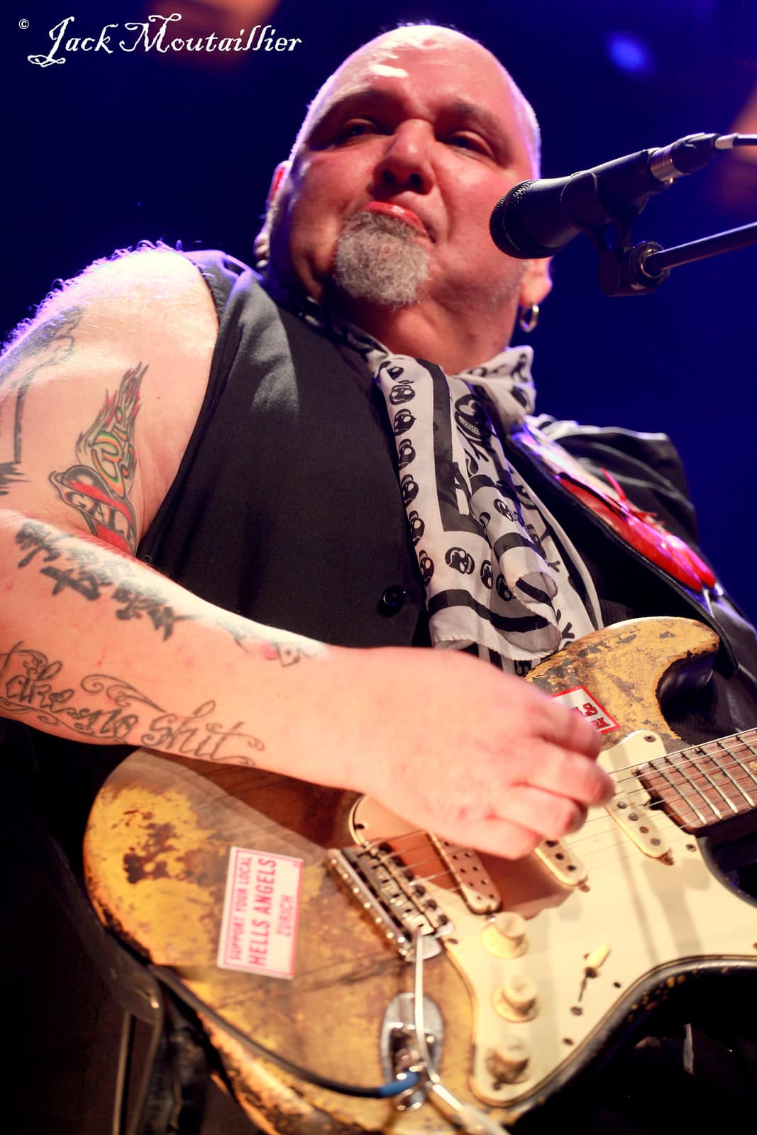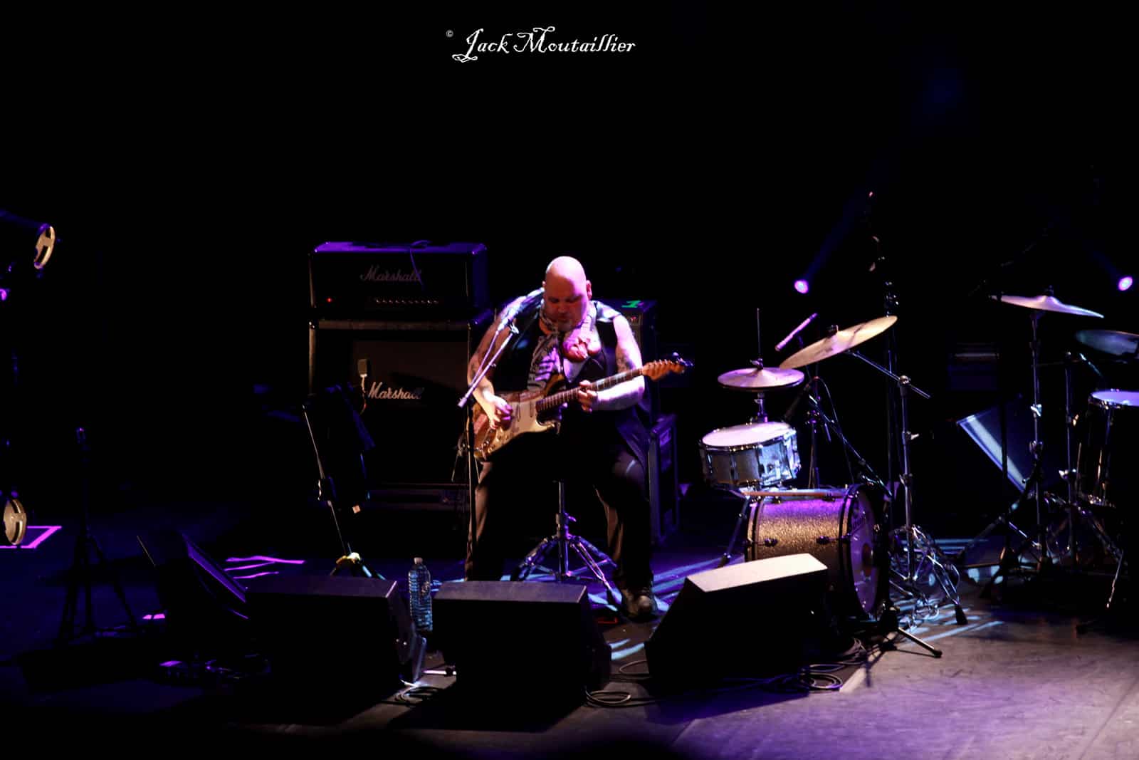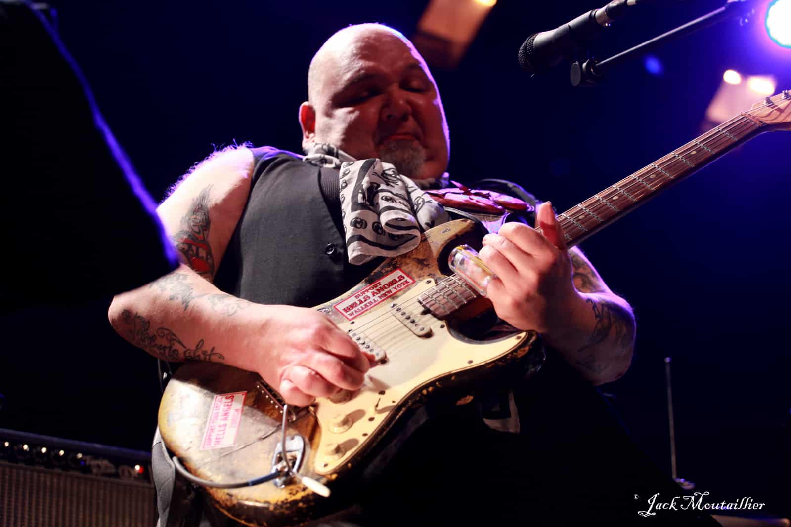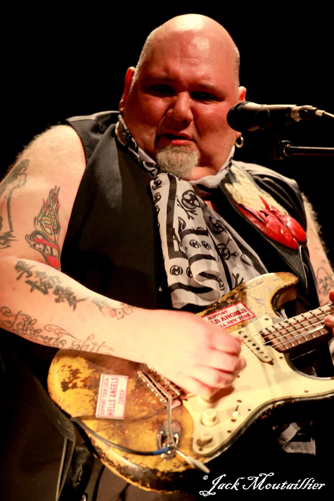 Il va s’assoir sur un tabouret renforcé, se penche avec difficulté pour brancher sa guitare, et là…. dès les premiers accords de guitare, c’est la grosse baffe! Nous ressentons immédiatement cette magie que le blues-rocker a dans les doigts, pour balancer un son bien gras et qui vous fait frissonner. Le truc en plus que pas mal de grands gratteux n’arrivent pas à vous procurer.