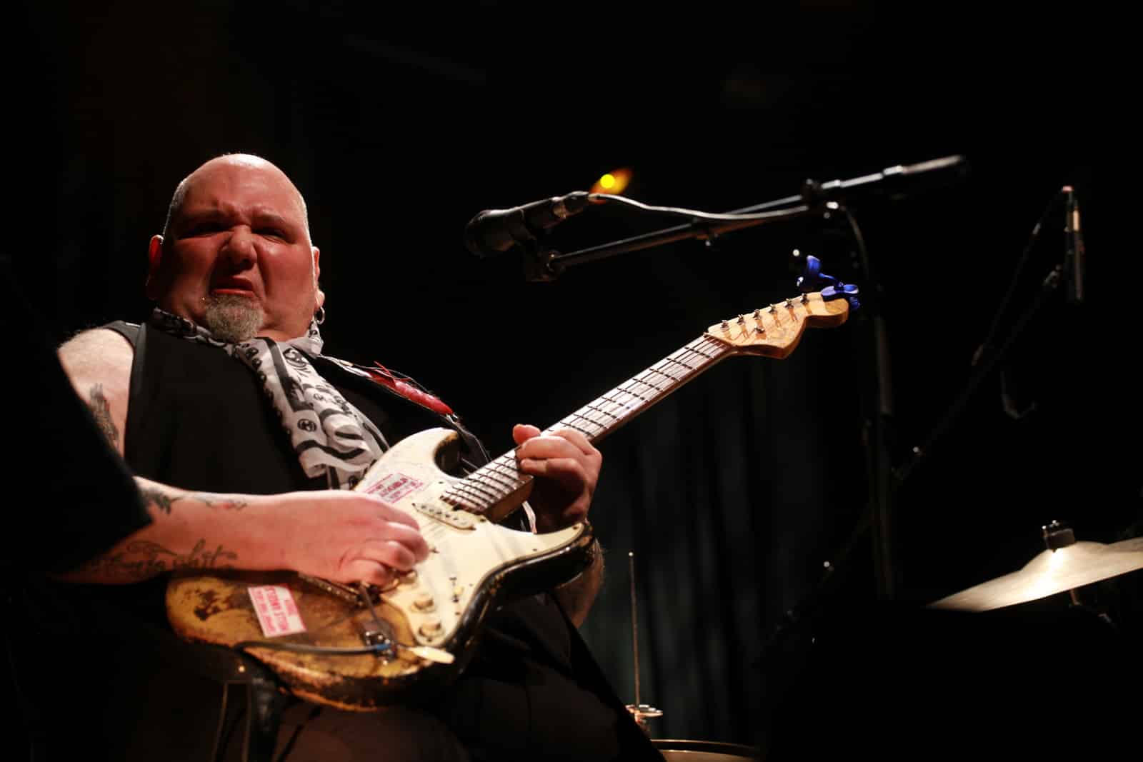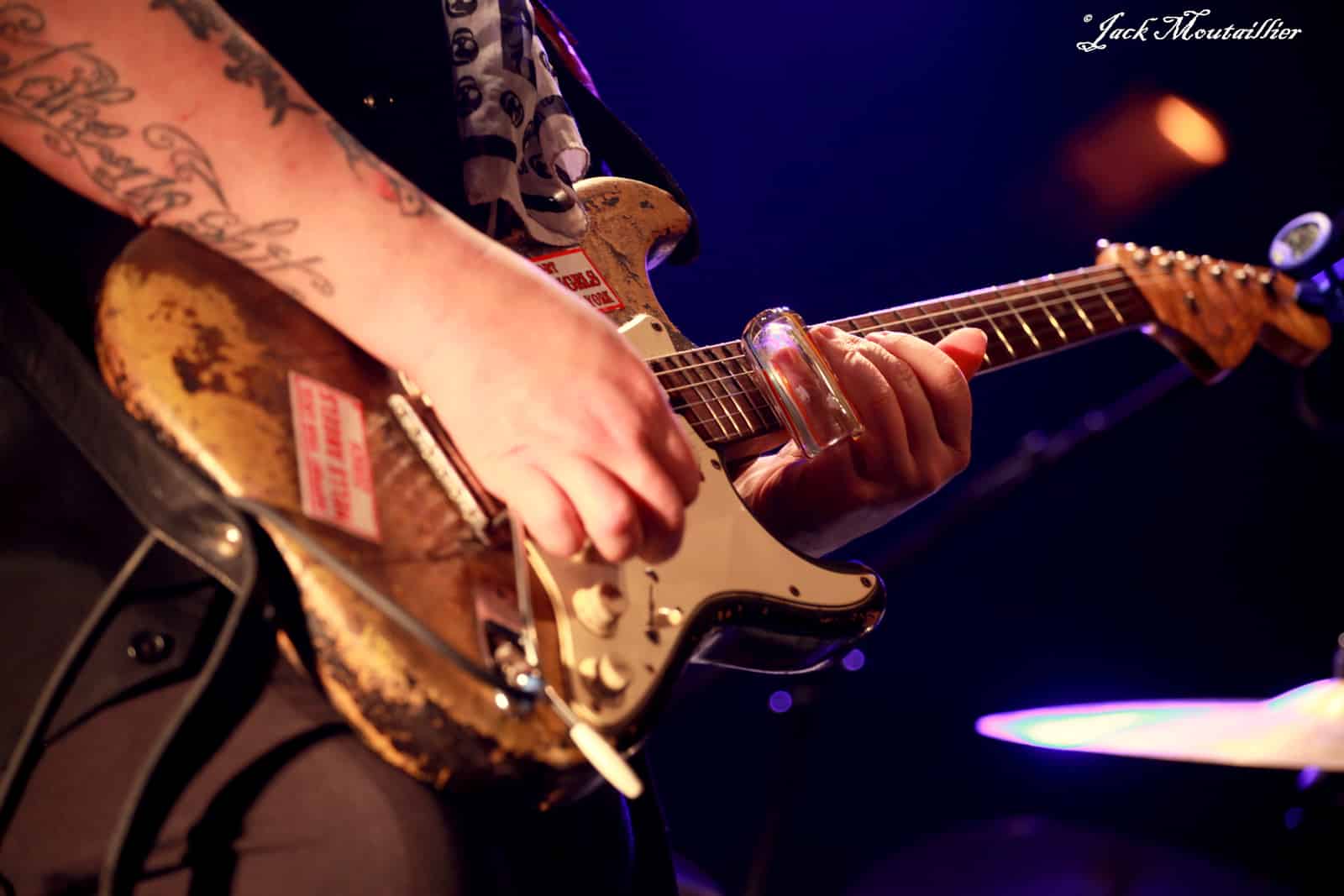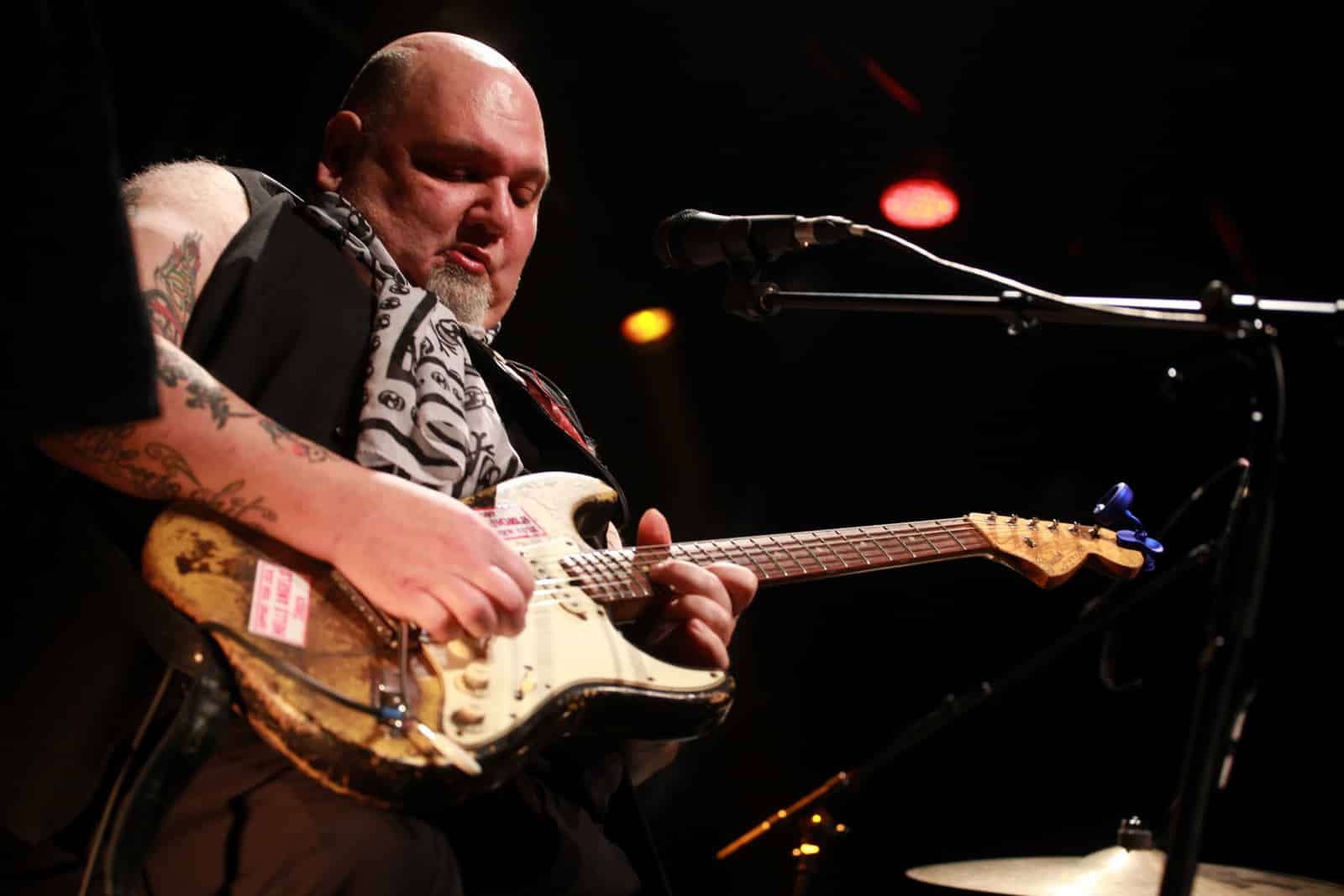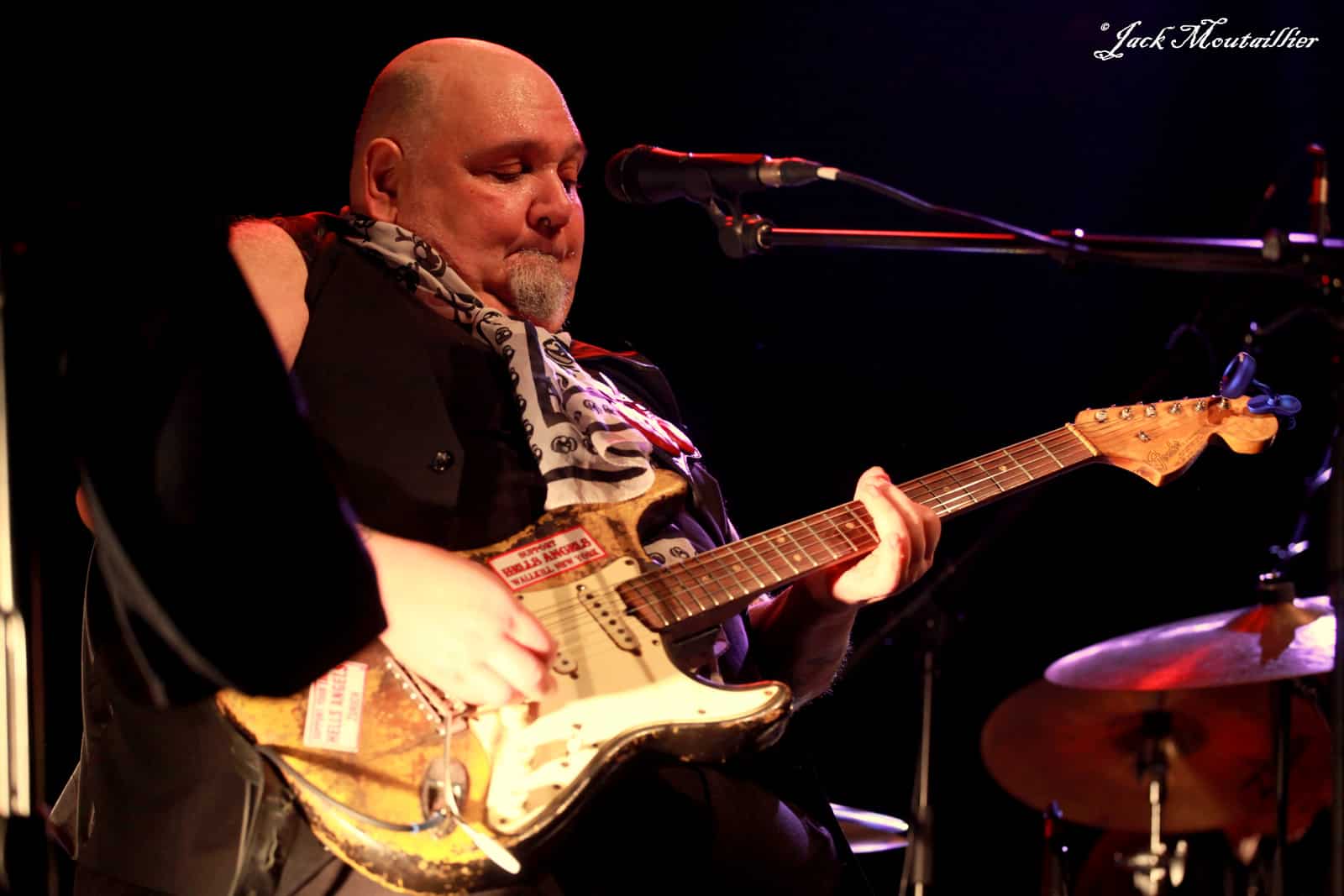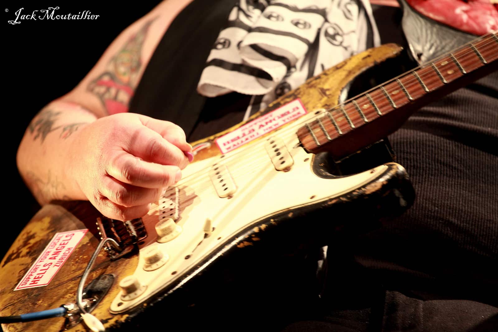 Il va s’assoir sur un tabouret renforcé, se penche avec difficulté pour brancher sa guitare, et là…. dès les premiers accords de guitare, c’est la grosse baffe! Nous ressentons immédiatement cette magie que le blues-rocker a dans les doigts, pour balancer un son bien gras et qui vous fait frissonner. Le truc en plus que pas mal de grands gratteux n’arrivent pas à vous procurer.