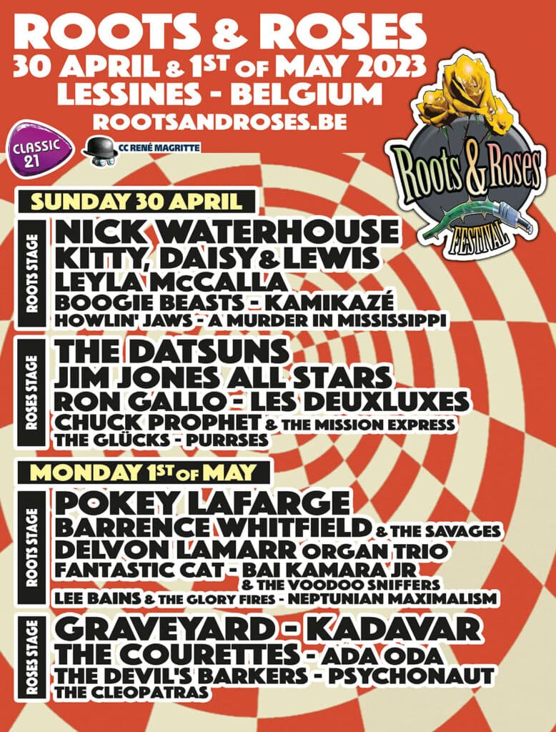 Le Roots & Roses festival, rendez-vous incontournable des amoureux des formes modernes de folk, blues, rock’n’roll et garage, s’est tenu les 30 avril et 1er mai 2023 à Lessines (BE), dans la province du Hainaut, à 60 km de Lille, sous deux chapiteaux géants dans un cadre verdoyant. Au-delà des duos mixtes bruitistes qui ont fait florès après l’épiphénomène White Stripes (The Courettes, Les Deuxluxes), il convient de saluer l’ouverture inédite au stoner avec les deux têtes d’affiche du dimanche: Kadavar et Graveyard.