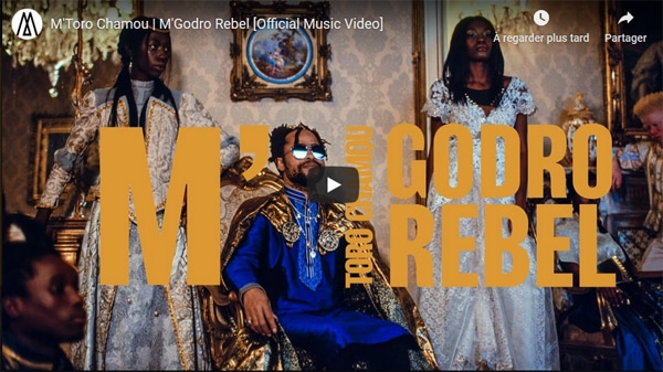 La vidéo de M’Godro Rebel a été tournée en Afrique du Sud, un lieu choisi spécialement pour son histoire. Le clip de M’Toro Chamou met en avant la beauté et la richesse du peuple africain. Et revendique le fait qu’il faut sortir de la représentation classique occidentale de la richesse. Cette vidéo nous transporte dans un univers fantasmagorique où l’on voit des personnages afro vêtus de tenues d’apparat dans un décor rococo du 18ème disparaitre comme s’ils n’avaient jamais existé.