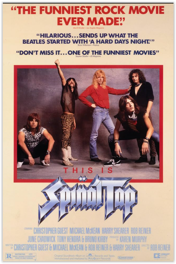 This Is Spinal Tap was released to critical acclaim, but found only modest commercial success in theaters. Its later VHS release brought greater success and a cult following. Credited with “effectively” launching the mockumentary genre, it is also notable as the origin of the phrase “up to eleven”. Deemed “culturally, historically, or aesthetically significant” by the Library of Congress, it was selected for preservation in the National Film Registry in 2002. Reiner, Guest, McKean, and Shearer reprised their roles for the 2025 sequel Spinal Tap II: The End Continues and the 2026 concert film Spinal Tap at Stonehenge: The Final Finale.” (Wikipedia page)