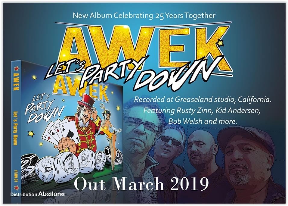 Un boulanger fait du pain, un cuisinier la cuisine et un chaudronnier fignole des carrosseries… 25 ans déjà que ces quatre-là creusent le même sillon, et on se méprendrait presque à trouver cela banal… Sauf que ce quatuor occitan dessine le parcours le plus singulier qui se puisse rêver pour un blues band issu de notre Hexagone. Qu’ils évoquent Slim Harpo sur “Every Time” et “Here I Am Again”, Jimmy Reed (et Lazy Lester) sur “Want You To Be My Girl” et “She’s Messing Around”, Muddy Waters (et Big Walter Horton) sur “Snake Boy” et “Feel So Cold”, Roy Brown et Wynonie Harris sur “Early Every Morning”, ou encore les early T-Birds sur “Can’t Stop Thinking”, Mike Morgan sur “Oh Chérie” et Hollywood Fats sur la plage titulaire, AWEK s’exprime en effet, au fil des diverses formes de blues qu’il aborde, comme s’il s’agissait de sa langue vernaculaire. C’est non seulement le fruit de près de 2.000 concerts en un quart de siècle, mais aussi celui d’une attitude aussi intrépide que décomplexée au regard de l’exercice. Ces types n’imitent en effet pas davantage quiconque qu’ils ne feignent de ressentir cette musique: ils la transpirent avec le même naturel et la même légitimité que n’importe quel autre artiste de l’international blues first-league, à laquelle ils appartiennent de plein droit. Dès lors, la liste des guests venus se joindre à eux n’en paraît que plus évidente: outre Rusty Zinn, Drew Davies et Bob Welsh, leur hôte et producteur Kid Andersen s’octroie également son featuring. Car c’est bel et bien chez ce sorcier de San Diego, en ses studios Greaseland, que AWEK vient d’enregistrer son nouvel album. Tout comme Tommy Castro, les Nightcats et Rockin’ Johnny auparavant, oui. Plus que jamais swing et classe, la rythmique aérée que prodiguent Joël Ferron et Olivier Trebel déroule la piste de décollage ad hoc pour les deux solistes, Bernard Sellam et Stéphane Bertolino (ici au sommet de leur art en toute circonstance). Pour mieux apprécier si nécessaire l’étendue du chemin parcouru depuis leurs débuts, nos amis offrent en prime un plein bonus de choice cuts issus de leurs concerts de 1995 à 2017. Ce double CD porte bien son titre: fiesta à tous les étages, et un foutu classique de surcroît…!