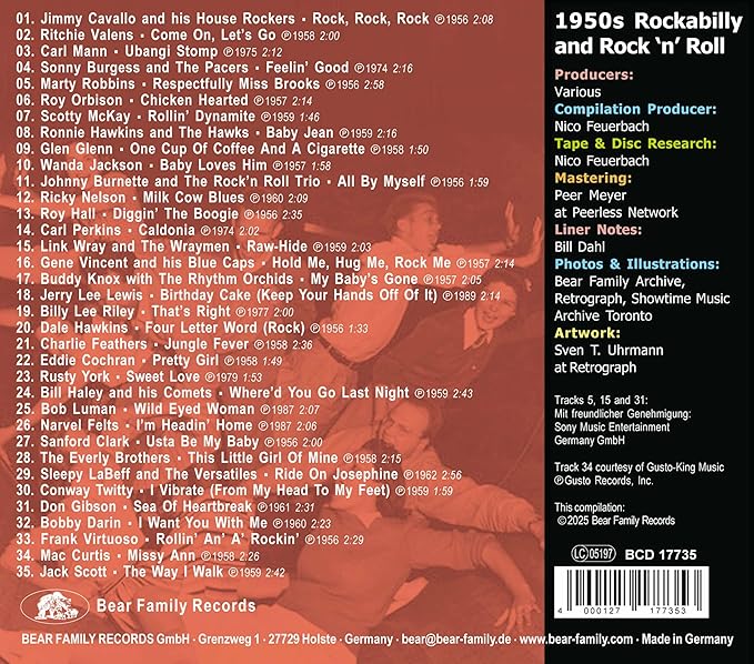 Notre saga entamée avec la Bear Family se poursuit avec cet album BEAR FAMILY RECORDS ROCKS, VOL. 2 qui reprend 35 titres représentatif du genre et des années 50. Des artistes connus, Ritchie Valens, Ray Orbison, Ricky Nelson, Carl Perkins ou Link Wray et d’autres moins connus (je suppose?), Roy Hall, Conway Twitty, Narvel Felts… Toujours est-il que les popotins remuent dans les chaumières! Des morceaux connus et d’autres beaucoup moins connus que l’on découvre avec énormément de plaisir. Cela commence en 1956 et se termine en 1987. Preuve, s’il en est, que quand la musique est bonne, elle a vocation à rester gravée. On se laisse bercer par le rythme et soudain, une voix et un rythme sortent du lot et attirent l’attention tellement c’est bon! La preuve que nos plus ou moins “anciens” savaient déjà apprécier la bonne musique. Mais qui en doutait vraiment? Les disques sont toujours proposés dans un coffret qui contient un livret d’une quarantaine de pages qui présente tous les artistes en présence sur l’album. Un document précieux que l’on prend plaisir à consulter en écoutant les 35 titres défiler… et que l’on réécoute, avec encore plus de plaisir.