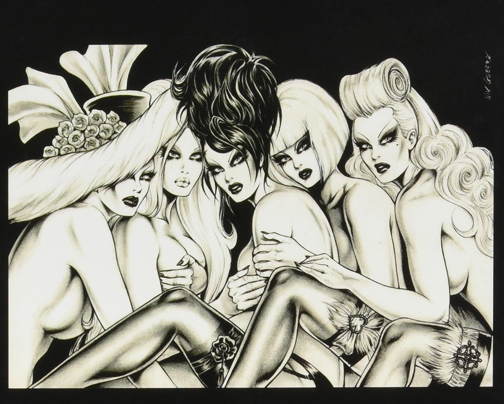 Moins connu du grand public que ses compatriotes italiens Milo Manara (Le Déclic), Paolo Eleuteri Serpieri (Druuna) ou Roberto Baldazzini (Casa HowHard), Nicola “Nik” Guerra n’est pas pour autant passé sous le radar des spécialistes français de l’érotisme. Sa contribution au genre a en effet été renseignée, avec forces louanges, dans La Bande Dessinée Erotique (La Musardine, 2007). Et plus récemment dans Les 100 Plus Belles Planches De La BD Erotique (Beaux Arts, 2015), où l’esthète de la fesse Vincent Bernière dresse fort à propos un rapport de filiation entre Magenta, Bienvenue En Enfer (Delcourt, 2015) et les “fumetti neri” des années 60. Ce recueil des 100 meilleures pin-up de Guerra exécutées en noir et blanc, avec l’apport mesuré de rouge sang pour les lèvres, ongles et accessoires fétichistes, rend compte de ses points forts. Dont le sculpté des chevelures-choucroutes, la démesure des cils et le plissé des bas nylons – les attributs de ses libertines sophistiquées – ne sont pas des moindres. En compulsant l’ouvrage au fort pouvoir de suggestion, on entend presque résonner la dark wave qu’écoutait l’artiste à l’adolescence. Défaut chez d’autres, l’écart par rapport à la réalité est ici une signature… La marque des grands. Note aux collectionneurs fortunés: Dark Divas, dans sa version coffret de luxe Graph Zeppelin/ Tabou limité à 200 (hors commerce) + 800 exemplaires, comprend respectivement 12 et 8 ex-libris.