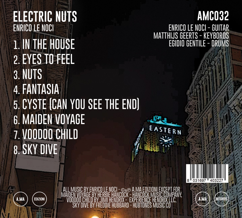 Pour ce nouvel album, c’est le Trio du guitariste Enrico Le Noci, accompagné de Matthijs Geerts aux keyboards et piano électrique, et Egidio Gentile à la batterie. En fusionnant les influences des trios de jazz à l’orgue dirigés par Grant Green, Jimmy Smith et Wes Montgomery avec la guitare blues de Jimi Hendrix et les styles des compos de Herbie Hancock et Wayne Shorter, le trio d’Enrico Le Noci a créé Electric Nuts, un album sorti sur le label A.MA Records et qui reflète les rythmes afro-américains qui imprègnent la musique de nos pères jusqu’aux sons dynamiques de notre époque actuelle.