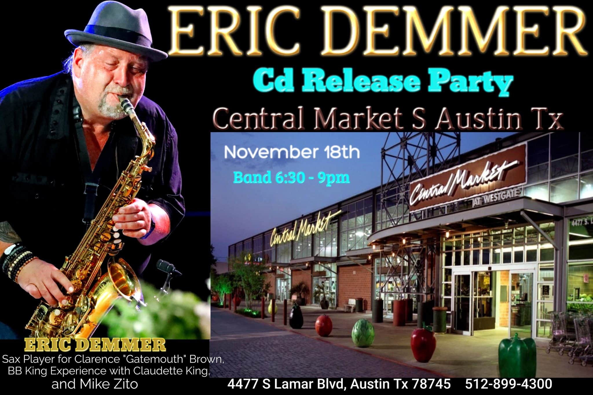Avec le saxophoniste texan Eric Demmer, on se trouve en présence du cas typique de “local boy makes good”. En effet, si on a pu l’entendre souffler sur quantité d’albums d’artistes de renom (de Clarence Gatemouth Brown à Mark May, en passant par John Ellison et Mike Zito), et s’il a également côtoyé, sur scène et en tournée, des pointures telles que Buddy Guy, Eric Clapton, Dr. John, Carlos Santana, Bonnie Raitt, B.B. King, Billy Gibbons, Shemekia Copeland ou les Allman Brothers, il demeure à ce jour essentiellement connu parmi le cercle des musiciens d’accompagnement (et moins du grand public). C’est sur le label de son principal employeur actuel qu’il publie son premier album solo, à la manière dont son aîné Bobby Keyes put également le faire en son temps avec les siens. Ce qui signifie que les invités s’y bousculent (on n’en dénombre pas moins de 17), au rang desquels les plus fameux (outre Zito himself) incluent Jonn Del Toro Richardson et l’organiste Barry Seelen. Mais peu importe le renom de chacun d’entre eux, puisqu’ils partagent tous avec Eric le dénominateur commun de n’être présents que pour servir la musique au sein d’un collectif. Et en la matière, ce bon Demmer s’ébroue avec un même bonheur en marigot funk (“Don’t Talk To Me”, “What Was I Thinking”, “Just Can’t Wait”, “Any Day Get Away” que chante sa fille Danielle, ou “Get Out Of Town”, avec un solo de guitare stratosphérique signé Mark May), en terre afro-cubaine (“She’s So Fine”) et en territoire sudiste (le languide “Will It Ever Be The Same” que chante Mike Zito, empruntant ses fiers accents à Skynyrd et aux premiers Doobies). Le Texas-shuffle et le rockin’ blues ne sont pas en reste (l’humoristique “I’m A Guitar Player” et “I’m Alright”, dans la veine de Johnny Winter et Mike Morgan), pas davantage que les slow soul numbers (“Start It All Again” et “Let Me Go”, avec les six cordes du non moins remarquable Hugo Rodriguez). Eric ferme le ban sur le up-tempo “Have You Ever Loved A Woman”, radicalement différent de celui de Billy Myles dont Clapton et Freddie King firent leur ordinaire. Les soli de son instrument à anches y rugissant de bout en bout avec gourmandise et gusto, voici un chouette good time record, comme son titre l’indique fort à propos.