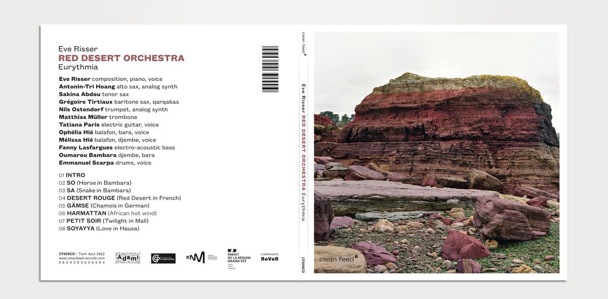 Conduit par Eve Risser, le RED DESERT ORCHESTRA est formation hybride composée de musiciens et musiciennes d’Europe et d’Afrique. Partie prenante d’une dizaine de formations différentes, du solo au grand ensemble, la pianiste est à l’origine de tous les morceaux composés sur cet album. Elle ajoute à son orchestre les sonorités des balafons, djembés et bara. Autour d’elle pour cet opus où elle est à la composition, au piano, piano préparé et à la voix, on retrouve Antonin-Tri Hoang, sax alto et synthétiseur analogique, Sakina Abdou, sax ténor, Grégoire Tirtiaux, sax baryton et carcabas, Nils Ostendorf, trompette et synthétiseur analogique, Matthias Müller, trombone, Tatiana Paris, guitare électrique et chant, Ophélia Hié, balafon, bara et voix, Mélissa Hié, balafon, djembé et voix, Fanny Lasfargues, djembé et bara, Oumarou Bambara, djembé et bara, Emmanuel Scarpa, batterie et voix, et Céline Grangey à la voix. Sur cet album de world music difficile à classifier tant la musique est colorée, 8 titres (en fait 7 morceaux et une intro – voir le tracklisting sous la chronique) interprétés par un orchestre de 13 participants talentueux. Eve Risser semble être à la recherche d’une transe douce car ses compositions se situent entre “la danse, la techno, la musique d’Afrique de l’Ouest, le romantisme et l’expressionnisme“, nous dit-elle. Les musiciens ont travaillé à partir de l’oral, souhaitant entrer dans un processus lent pour laisser mûrir chaque idée, laissant la musique s’ancrer en chacun d’entre eux. Quelque chose de novateur, coloré et lumineux qui ne laissera personne indifférent.