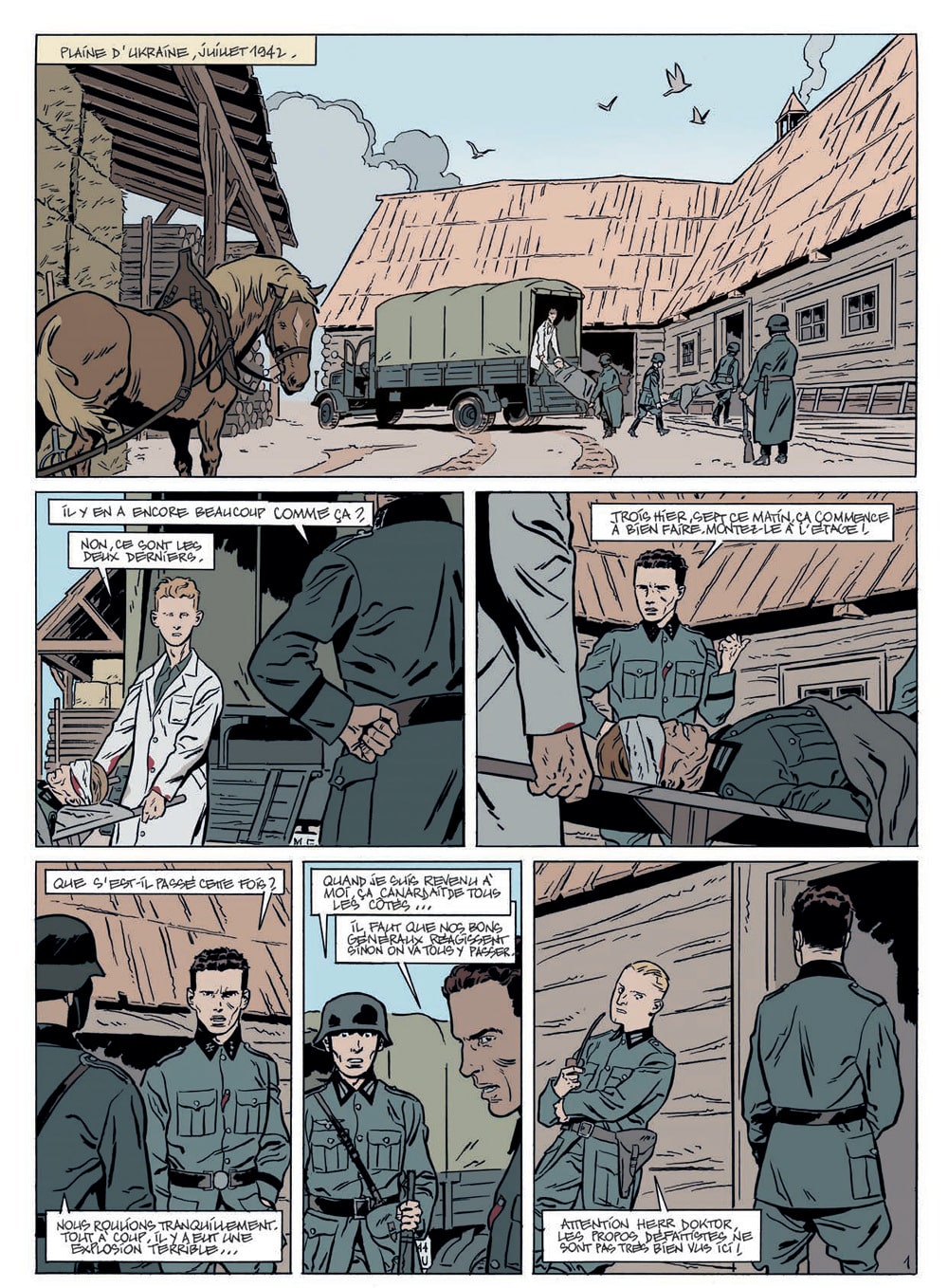 Plein Vent, nouvelle maison d’édition dédiée à la bande dessinée et à la littérature jeunesse, propose en un volume Herr Doktor 1 – La Peste Et Le Choléra, sorti en 2015 chez Artège BD (groupe Elidia), ainsi que sa suite, Septicémie, bouclée grâce au financement participatif Ulule de 2019. Lorsque la France est écrasée par l’Allemagne en 1940, l’Alsace est rattachée au Reich. Martin, médecin alsacien, envoie alors son épouse juive et sa fille à Paris, avant d’être engagé de force sur le front de l’Est. Le trait de Régis Parenteau-Denoël (Honoré d’Estienne d’Orves aux Editions du Rocher, pochettes des LP Psyché France chez Warner), un peu trop rapide à notre goût, n’est pas sans évoquer ceux de François Boucq pour les visages et Alex Varenne pour les chevelures. Son ami Jean-François Vivier aborde, avec une remarquable droiture intellectuelle, les sujets qui fâchent encore de nos jours (la rafle du Vel d’Hiv, la flotte vichiste de Toulon) et raconte l’inhumanité sans tomber dans le gore… Pourtant, à l’Est, entre la peste (les exactions hitlériennes par les armes) et le cholera (la répression stalinienne par la famine), les Koulaks choisissent d’échanger leurs enfants parce qu’il est plus facile de manger ceux des autres. Après le placement de produit/ clin d’œil à l’aumônier Franz Stock, sujet d’un ouvrage des même auteurs (2016), Septicémie embraie sur une seconde uchronie: l’assassinat d’Hitler, avec un twist final qui ouvre la perspective d’un troisième volet plus russe qu’allemand. Et, en filigrane, cette morale que les faibles deviennent toujours complices par leur silence.