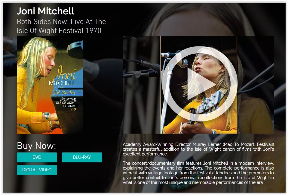 La bande annonce de ce DVD “JONI MITCHELL – Both Sides Now – Live At The Isle Of Wight Festival 1970” est sur YouTube, ICI