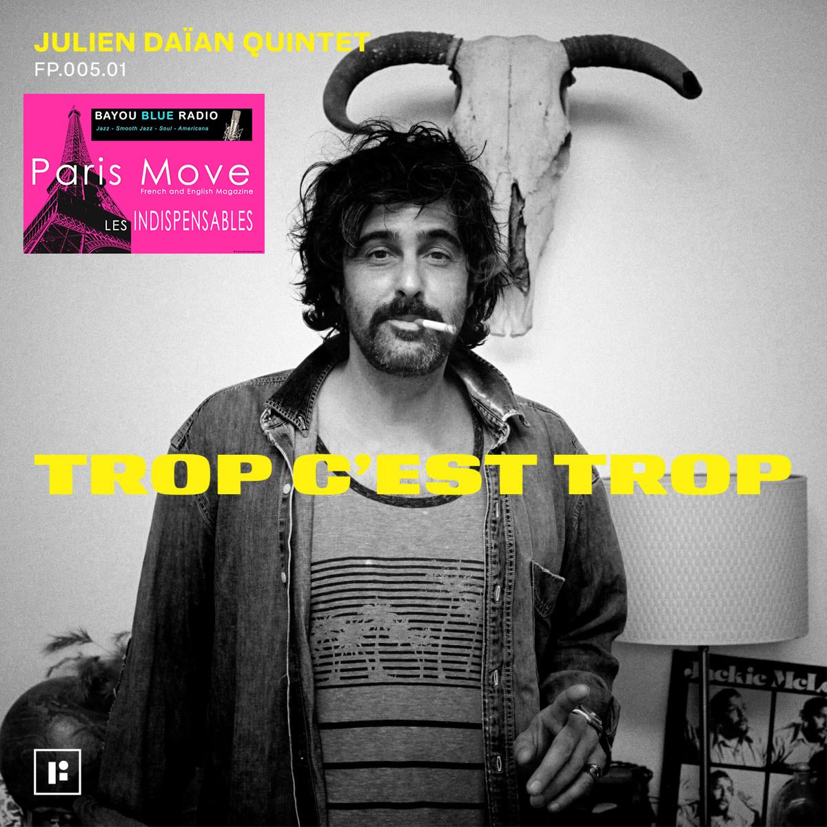 Julien Daian est un artiste que nous aimons particulièrement sur Bayou Blue Radio. Nous avions déjà longuement diffusé les albums Behind The Reef et French Paradox au cours des années précédentes, et cette fois c’est par un single à paraître “Trop C’est Trop”, le 30 avril, que nous présenterons le nouvel opus du Julien Daian Quintet, un titre aux accents “gainsbouriens”, reflet d’une époque où le ras le bol de la population est à son paroxysme face au pouvoir et à la situation actuelle en France. Ce titre raisonnera sans aucun doute comme un hymne ralliant toutes les têtes pensantes qui n’ont plus le droit à la parole en public, oui, car Trop C’est Trop!