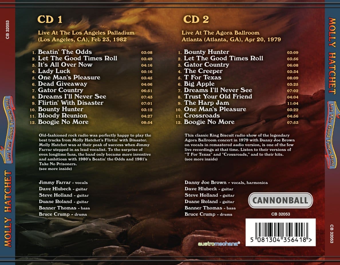 Conscients du marché que représente le fétichisme rock, quelques obscurs labels alimentent depuis 2015 la filière traditionnelle des distributeurs (Soundworks) et détaillants (Amazon) d’albums de concerts radiodiffusés au packaging soigné. L’activité, tolérée, concerne tout de même des “bootlegs”, en référence à la contrebande d’alcool pendant le prohibition aux Etats-Unis, puisque les droits d’auteurs s’exercent jusqu’à 70 ans après le décès de ces derniers. Les deux concerts de ce coffret, précédemment disponibles sur Live At The Agora Ballroom (2000, Phoenix Gems) et Setlist pour 5 titres sur 12 (2012, Epic/ Sony) sont issus du court âge d’or de Molly Hatchet, en mono “soundboard” et public en stéréo. Le groupe de Jacksonville, FL, qui tire son nom d’une prostituée du Sud qui décapitait ses clients, a fait battre pavillon confédéré après le retrait de Lynyrd Skynyrd en 1977. A l’Agora Ballroom d’Atlanta, GA, le 20 avril 1979, le chanteur Danny Joe Brown (1955-2005) donne du choo-choo à l’harmonica sur une “Harp Jam” de 11 minutes, laissant ses trois guitaristes (dont Dave Hlubeck, sous-mixé à la slide) se lancer dans une course à l’échalotte. Au Los Angeles Palladium, CA, le 23 février 1982, c’est son remplaçant Jimmy Farrar (1950-2018) qui bombe le torse au milieu des cuivres de Tower Of Power (“Lady Luck”). C’est paradoxalement le double live suivant, officiel, Battleground (2019, SPV/ Steamhammer), qui sent le whisky frelaté. Molly Hatchet, dont tous les membres fondateurs reposent six pieds sous terre, exploite désormais une marque déposée… avec un seul guitariste – Bobby Ingram – et son harmoniseur!