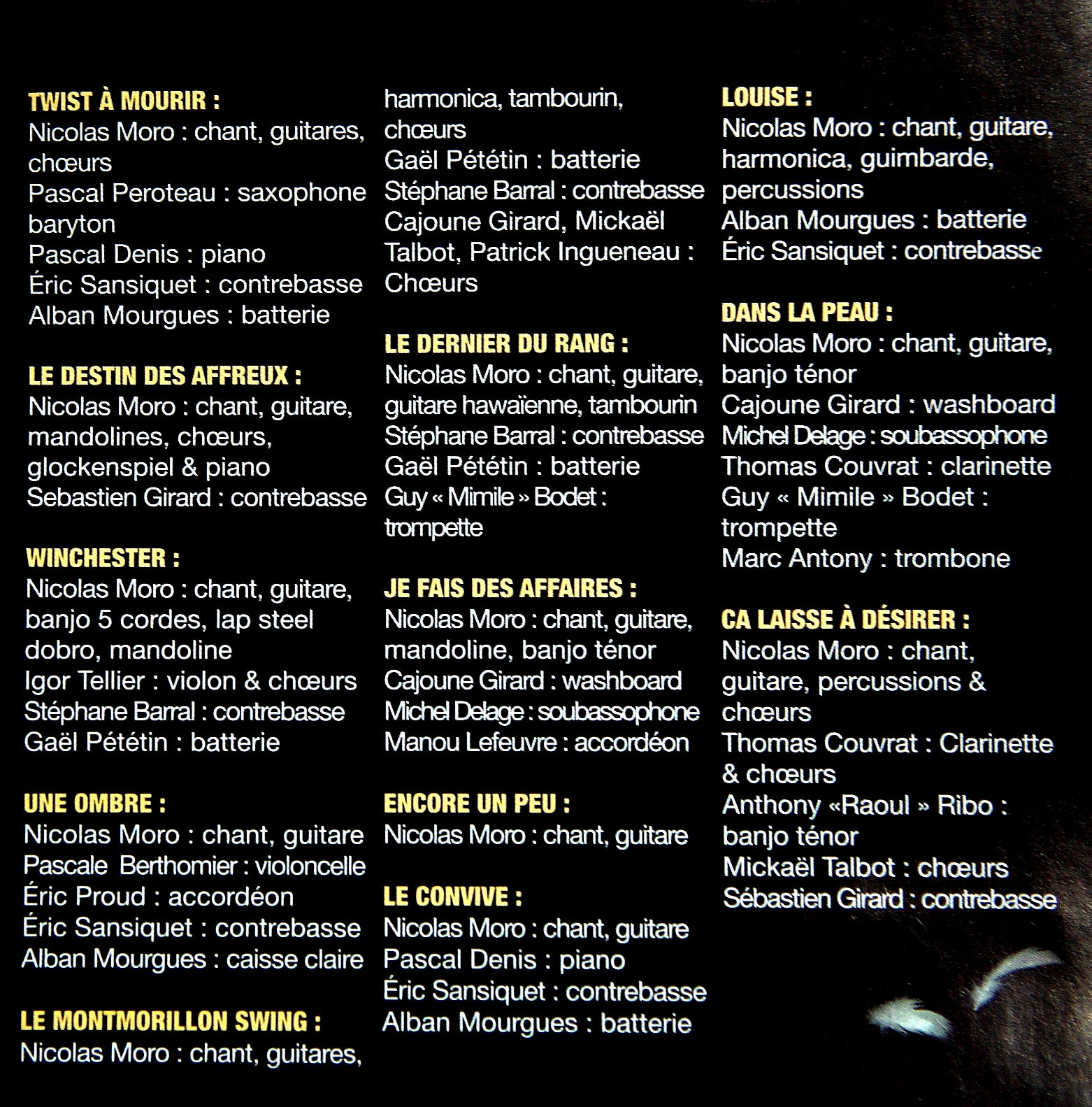 Au fil des titres de cet album, Nicolas Moro est accompagné d’une vingtaine de musiciens confirmés. Ils sont cités sur cette page du livret, que je vous propose ici: