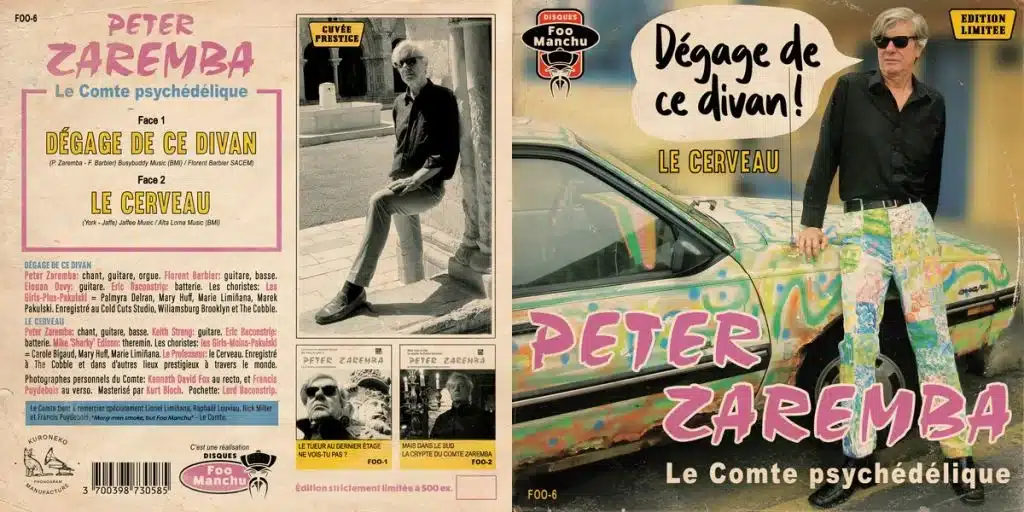 Peter Zaremba est, comme chacun sait, le leader-chanteur des légendaires Fleshtones, originaires du comté du Queens à New-York City. Le Comte Zaremba a délaissé momentanément sa crypte pour donner une suite à ces 45 tours concepts entre psychédélisme, légende urbaine, sciences occultes et yéyé made in France des 60’s, dans la lignée du Comte Dracula de Transylvanie et de son amour sans borne pour les carotides volumineuses et des facéties d’Hector, surnommé au Golf Drouot le Chopin du Twist, roi de la provoc et des performances scéniques théâtrales, qui prenait un malin plaisir à briser tous les tabous et tous les codes, bien avant Alice Cooper, The Plasmatics et Marilyn Manson. En effet, entre Peter Zaremba et la France, c’est une longue histoire d’amour. A force de la sillonner inlassablement et de prêcher la bonne parole du rock’n’roll dans des endroits les plus austères, là où les trains ne s’arrêtent jamais, d’avoir croisé le fer avec ses frères d’armes Dominique Laboubée et les Dogs de Rouen, Tony Truant et bien d’autres, Peter Zaremba rêvait de chanter dans la langue, non pas de Molière ou d’Hugo, mais plutôt la langue de Dutronc, Nino Ferrer, Noël Deschamps, Jacqueline Taïeb ou Ronnie Bird, dans la plus pure tradition du yéyé psychédélique et du rock’n’roll français des 60’s. Zaremba le vampire rock, s’était déjà prêté au jeu et à l’exercice en participant activement avec les Fleshtones au mini-album 5 titres de Tony Truant en 2005, Allo Brooklyn, Ici Montmartre avec quelques compos bien senties et quelques reprises superbement envoyées comme Maman n’aime pas ma musique, tube glam-rock de Dick Rivers de 1974 ou encore J’vais m’en j’ter un derrière la cravate de Mac-Kac de 1956, titre signé Moustache et Sacha Distel… Sans oublier le remarquable et tant mérité hommage au leader des Dogs en 2015, avec le titre intitulé sobrement Dominique Laboubée. Au sein du premier titre du présent single intitulé Dégage de ce Divan! aux influences très Cramps, voire Ici Paris, avec son imaginaire fantasmagorique bien trempé, entre train fantôme de la Foire du Trône, spectre de Jim Morrison au cimetière du Père Lachaise, Shining de Stephen King, crypte lugubre, châteaux hantés et soucoupes volantes, on retrouve avec plaisir une autre figure du rock normand, entre Evreux et Le Havre, en la personne de Florent Barbier, ex batteur des fameux Roadrunners (fleurons du rock made in Normandie avec Little Bob Story et les Dogs), expatrié aux Etats-Unis depuis belle lurette et qui, cette fois, assure la guitare et la basse. Quant à Peter, comme à l’accoutumée, il assure de main de maître le chant, la guitare et l’orgue. La Face 2 est Le Cerveau, avec toujours les mêmes influences surnaturelles et Peter en qualité de multi-instrumentiste, mais avec la présence de Keith Streng, premier couteau et excellent guitariste au sein des Fleshtones. Merci à Peter Zaremba et à Francis Puydebois (boss du label Disques Foo Manchu) pour ce comte psychédélique et ces moments suspendus. Un 45 tours INDISPENSABLE, rien que pour l’atmosphère Famille Addams qui en résulte et pour l’accent pointu à couper au couteau de Peter, entre Mick Jagger et Jane Birkin.
