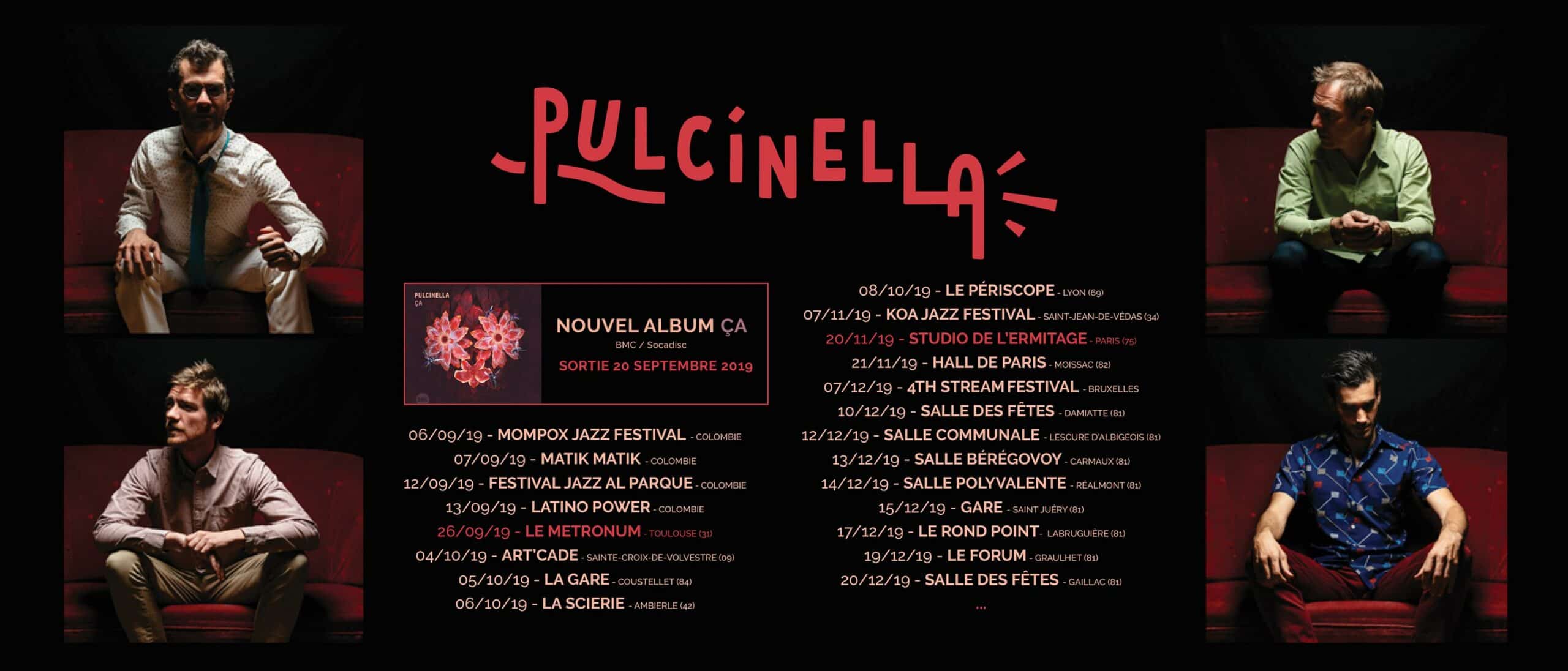 Depuis 15 ans, ce groupe toulousain espiègle ne se lasse pas de n’en faire qu’à sa tête. Armé d’une batterie, d’une contrebasse, d’un accordéon et d’un saxophone, il malaxe funk, jazz, musique des Balkans, électro, musette, rock progressif… pour créer une musique polymorphe et sans frontières. Avec plus de 600 concerts au compteur, Pulcinella est un véritable groupe de scène, il s’est notamment produit dans de prestigieux festivals comme Jazz in Marciac, le Festival Radio France, Rio Loco, Jazz sous les Pommiers, le London Jazz Festival, le Festival d’Odessa… Il a sillonné les routes d’une vingtaine de pays comme le Honduras, le Guatemala, la Bulgarie, le Tadjikistan, la Moldavie, la Colombie, l’Inde et même le Viêt Nam pour y fêter les 1.000 ans de la capitale Hanoï.