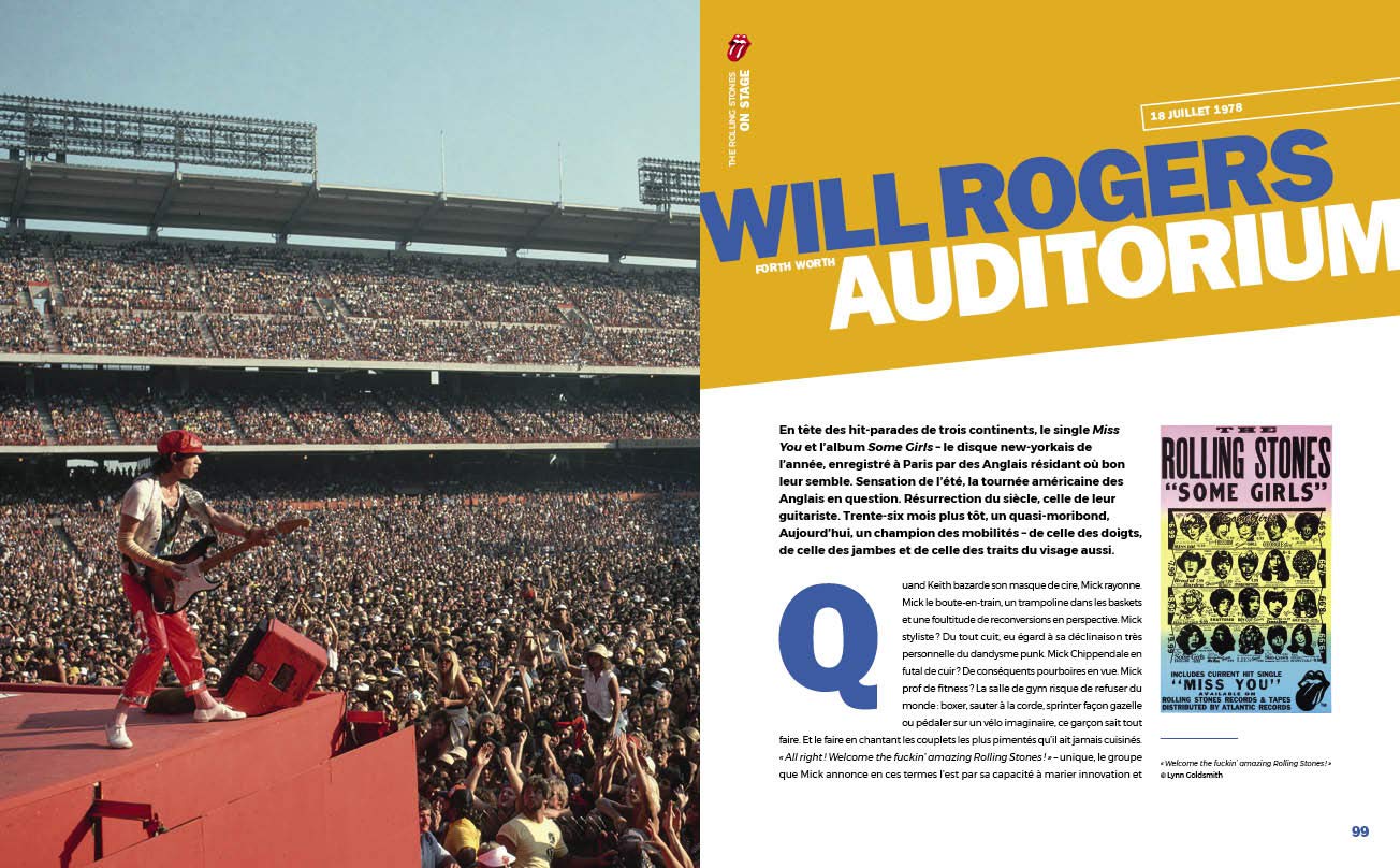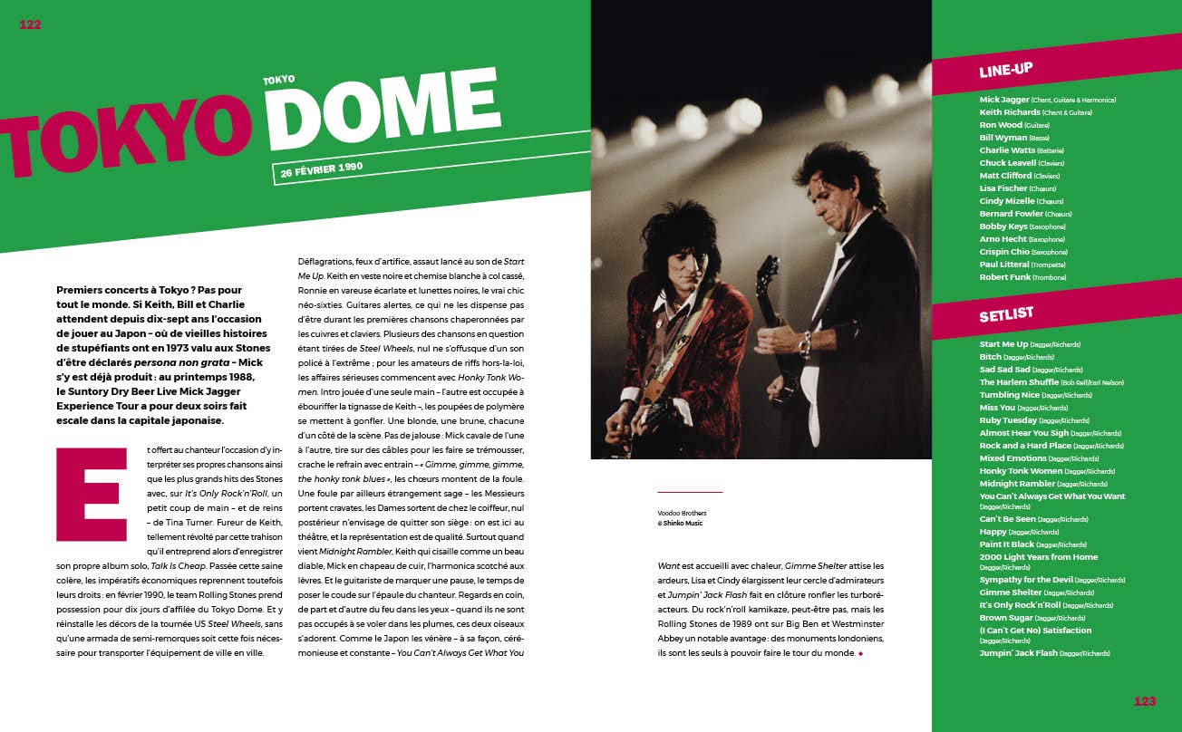 Les Rolling Stones ont sans aucun doute été les plus grands marchands de rêve d’un demi-siècle de prose rock. Même conservés dans le formol, ils restent l’étrange objet du désir de Bruno Juffin, auteur de “Lou Reed Et Le Velvet Underground” (J’ai Lu, 2001). Et surtout d’articles tirant parfois vers le “billet dur” pour le compte des Inrocks, dont on ne sait plus que penser depuis l’affaire de la ligue du LOL. 51 concerts-clés des Stones sont ici chroniqués avec une relative bienveillance, depuis le remplacement d’Alexis Korner au Marquee Club de Londres en 1962 jusqu’à l’escale du No Filter Tour au Stade Orange Vélodrome de Marseille en 2018. Effet scale-up garanti! Les dates à l’Olympia de 1964 à 1967, époque où les sièges du music-hall volaient, sont agrémentées de photos des incontournables Kasparian et Leloir. Parmi les concerts ayant fait l’objet d’une captation vidéo, dont celui du Beacon Theatre de New York en 2006 (aka Shine A Light, de Martin Scorsese, joint en blu-ray en fin d’ouvrage), on retiendra le festival d’Altamont en 1969 et cette image de Jagger incapable d’enrayer la mécanique du désastre pendant que les Hells Angels assurent le service d’ordre à coups de queues de billard… puis de couteau. La période de disette en concerts français de 1971 à 1975 est très justement expliquée par l’interdiction de territoire prononcée après une descente des stups à la villa Nellcôte, Villefranche-sur-Mer, où le groupe en exil fiscal “travaillait” sur le brouillon de leur double album de légende. Un ouvrage à la hauteur de la carrière du groupe, faite de triomphes, de tribulations et – pour reprendre la punchline de l’auteur – d’un son à l’épreuve des contrefaçons.