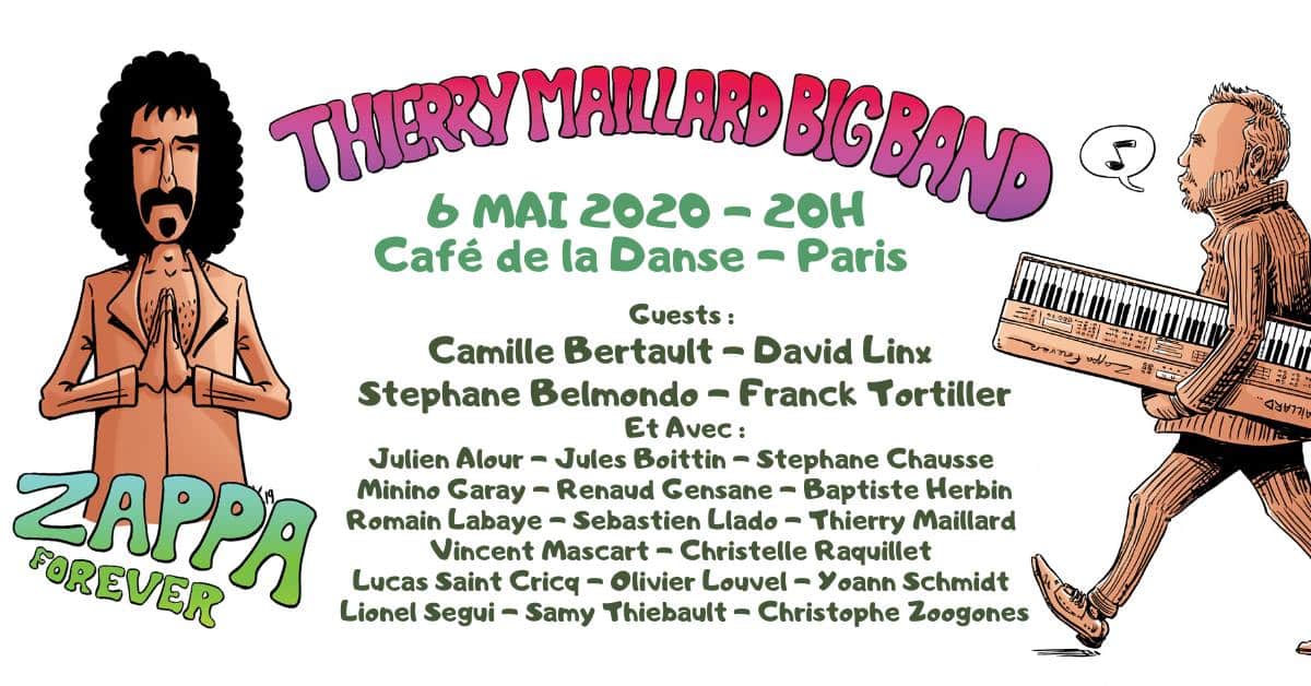 En langage d’alchimiste on aurait intitulé cet album du Thierry Maillard Big Band: “le Grand Œuvre”! Tant tous les ingrédients sont réunis pour que l’on parvienne à boire jusqu’à la lie non pas l’élixir philosophal mais l’élixir musical. Inspiré par l’immense esprit créatif du guitariste natif de Baltimore, Maryland (21/12/1940 – 04/15/1993), Thierry Maillard lui rend hommage avec ses magnifiques compositions, son travail d’ensemble et les prestigieux musiciens qui l’entourent. Tout le monde sait que réaliser un Big Band est un exploit, un tour de force autant humain que financier, car tout à la fois trouver les fonds et fidéliser une équipe est un travail de titan, et l’on ne peut que saluer avec tout le respect qu’il mérite ce grand musicien qu’est Thierry Maillard d’avoir réuni et fait cohabiter autour de lui des “pointures”. Ils sont 15 musiciens, dans ce Big Band: une basse, une batterie, deux flûtes (dont un joueur de piccolo), trois trompettes, deux sax alto (dont l’un joue aussi du barython), deux sax ténor (dont l’un joue également du soprano), un clarinettiste, basse, sib et ewi, trois trombones (dont un trombone basse)… et Thierry Maillard au piano, aux compositions, au nombre de 10, et aux arrangements. Près de 98 minutes de musique avec ce superbe double CD, et encore n’ai-je rien dit des prestigieux invités du Maître de cérémonie: Camille Berthault à la voix et au texte, David Linx également à la voix et au texte, Chris Potter au saxophone ténor, Gilad Hekselman à la guitare, Rhani Krija aux percussions, Franck Tortiller au vibraphone et Stéphane Belmondo au bugle. Tous ces immenses musiciens réunis pour interpréter les compositions du très grand pianiste qu’est Thierry Maillard et pour rendre donc rendre hommage au génial guitariste américain qui fut autant rockeur que jazzman, Frank Zappa. C’est le seizième album de Monsieur Thierry Maillard et c’est le second opus que Thierry réalise avec 15 musiciens, après l’excellent “Pursuit Of Happiness” qui présentait déjà cette configuration en Big Band.