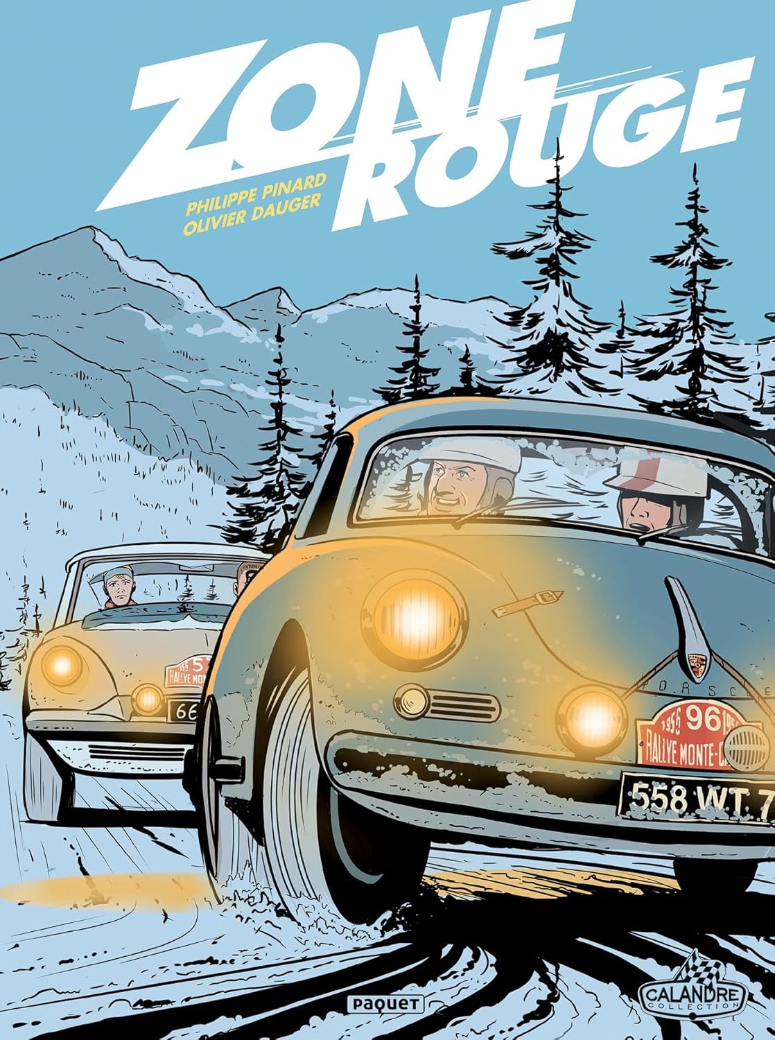 Meilleur vendeur de la prestigieuse concession Citroën des Champs-Elysées, Laurent Beaumont est sèchement congédié au cours du salon de l’auto 1955 par son patron cocufié. Mais le jeune homme, qui présente bien (l’accroche-cœur à la Michel Vaillant), n’est pas qu’un bonimenteur du Carreau du Temple. Vainqueur de la 6ème édition du Trophée de Provence au volant d’une vieille Traction 11 BL, il rêve d’une voiture plus compétitive, à la hauteur de ses ambitions. Son numéro de charme auprès de la jeune Lorène lui vaut d’intégrer Porsche, chez qui le sport est un véritable argument publicitaire… Or, la nouvelle Carrera 1500 GS, préparée par le bourru Ernst, n’a encore jamais remporté d’épreuve. Brillera-t-elle au Rallye de Monte-Carlo? Le duo d’auteurs, déjà célébré pour ses cinq albums Ciel En Ruine (2007-2012) dans la collection «Cockpit», prend ses aises dans cette France d’avant le grand remplacement. Le réalisme de la ligne claire d’Olivier Dauger, seulement pris en défaut dans quelques rares postures, est contrebalancé par le didactisme décomplexé des phylactères – jusque dans la chambre à coucher – de Philippe Pinard, jargonneux comme jamais. Un bijou de la collection «Calandre»!