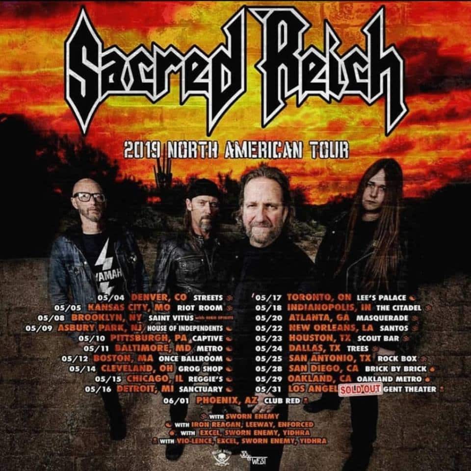 Sacred Reich is a Phoenix, Arizona based thrash metal band that formed in 1985. Part of the second wave of thrash along with Testament, Death Angel, Destruction and Dark Angel, Sacred Reich has produced a catalog of politically charged aggressive music that has stood the test of time. The band plays a limited amount of shows each year and can be seen performing at several European festivals each summer.
