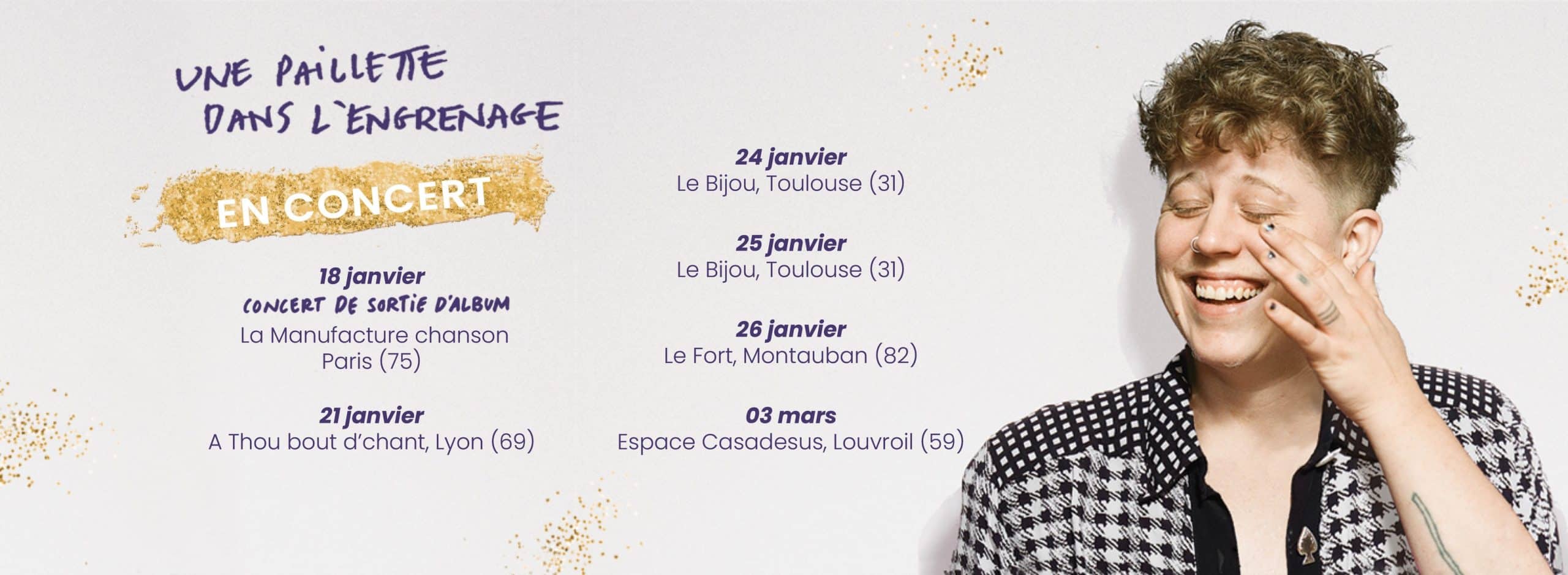 Samuele manie aussi bien les mots chantés, écrits ou parlés. Multi-instrumentiste, c’est par la musique que l’artiste partage sa poésie. Sa démarche artistique repose sur la conviction que le récit personnel et l’expression artistique sont des outils de changements sociaux. Depuis 2019, Samuele s’assume trans et non-binaire. Désormais en paix avec lui-même, l’artiste s’est lancé dans l’écriture de cet album avec l’envie de partager une énergie nouvelle. Une paillette dans l’engrenage, c’est l’idée que de petits gestes peuvent avoir une grande portée.