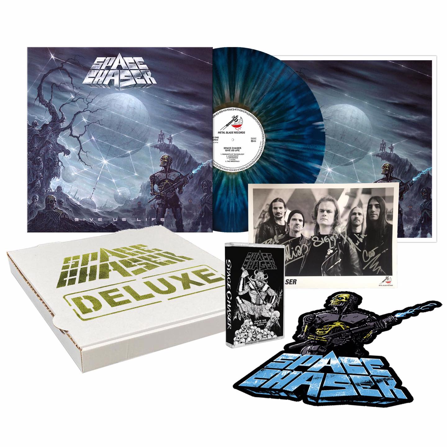 – coffret deluxe (boîte à pizza, vinyle bleu acier & or avec éclaboussures blanches, cassette démo, patch arrière, tirage d’art, carte signée – limité à 250 copies)