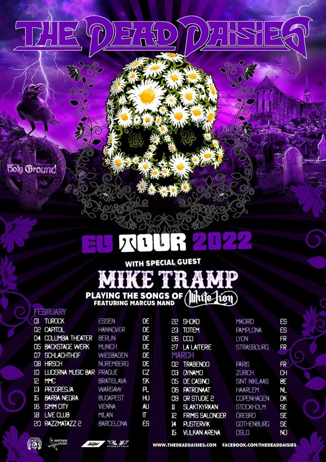 The Dead Daisies vont démarrer l’année 2022 en beauté avec une tournée paneuropéenne en tête d’affiche ! Ils en profiteront pour interpréter plusieurs morceaux de leur dernier album en date, “Holy Ground” et seront accompagnés dans ce périple à travers le Vieux Continent par un invité spécial : Mike Tramp. Cette tournée sera la première du groupe en Europe depuis 2018!
