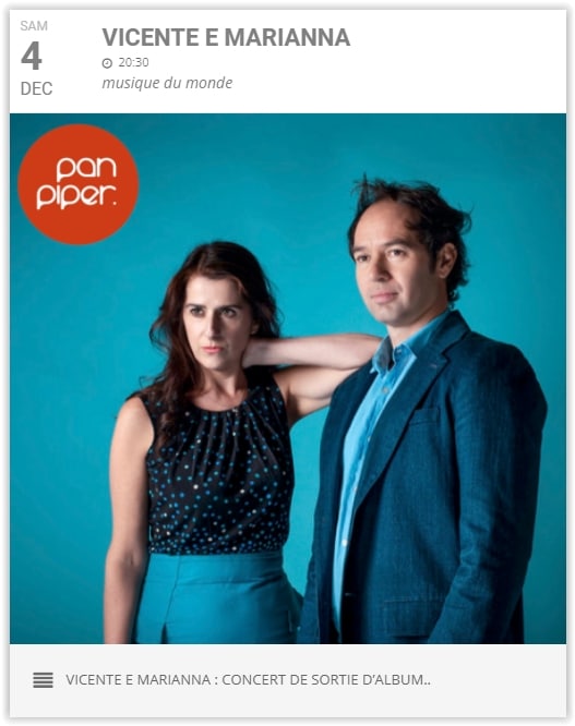 Vicente e Marianna sont de retour le 03 décembre pour un nouveau voyage musical de Paris à Salvador de Bahia au Brésil. Au gré de leurs compositions mélangeant la chanson française, le funk, le xote et la samba, avec une orchestration riche à la fois organique et urbaine, et de leurs adaptations françaises tout en finesse de pièces d’Egberto Gismonti, Baden Powell, Stefano Bollani, ce duo éclectique crée sans arrêt des ponts entre l’ici et l’ailleurs, et nous entraîne sur les chemins poétiques de nos identités multiples, celles de sang et celles de cœur.