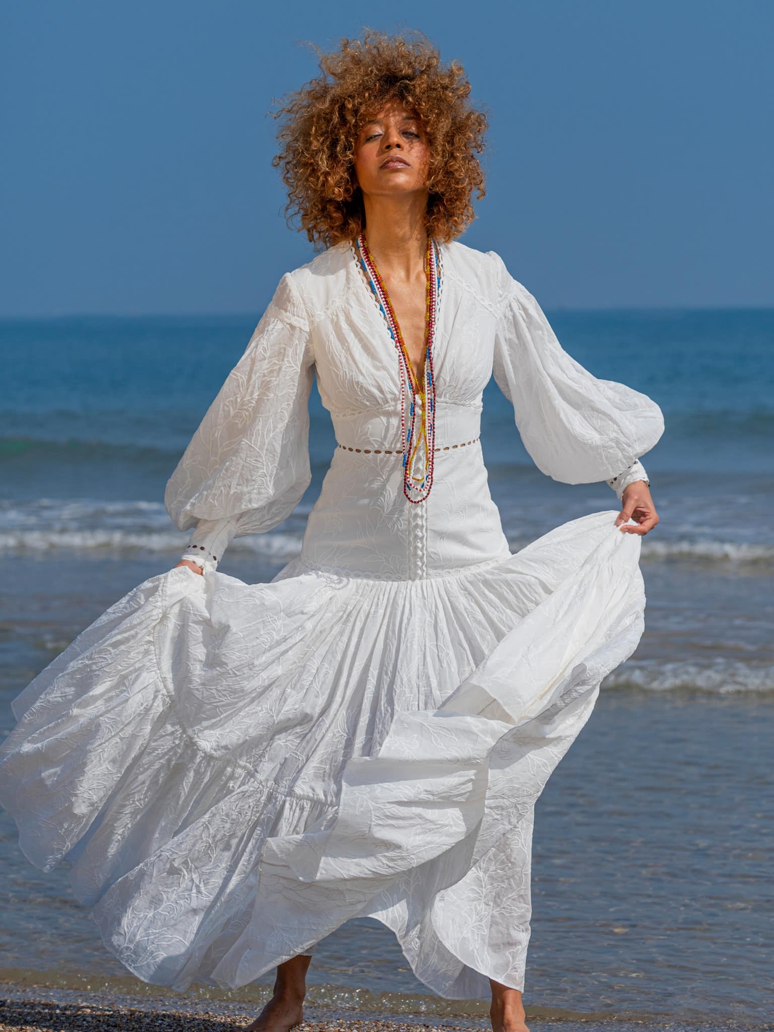 Yemayá symbolise la Terre-Mère. Elle est représentée par les couleurs bleu et blanc: le bleu pour les eaux placides de la mer et le blanc pour illustrer l’écume des vagues et la puissance de l’océan. Yilian Canizares utilise l’image de la Déesse yoruba de la mer, comme une force de guérison qui unira l’humanité.